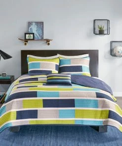 Olliix Mi Zone Bradley Brick Stripe Youth Coverlet Set, Lime Blue, Antimicrobial
