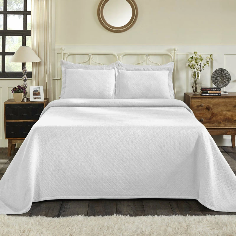 Sleep comfortably with the charming design of the Basketweave Bedspread Set. The classic pattern is crafted from 100% Cotton and boasts a woven matelassé pattern on a jacquard loom. Each set includes 2 matching pillow shams for a complete look (Twin/Twin XL sizes include 1 pillow sham). This bedspread can be used to layer with your existing bedding or warm enough to use on its own. This oversized bedspread hangs to the floor and eliminates the need for a bed skirt to hid unsightly under bed storage. Add matching sheets or extra pillowcases, sold separately, for a complete look.