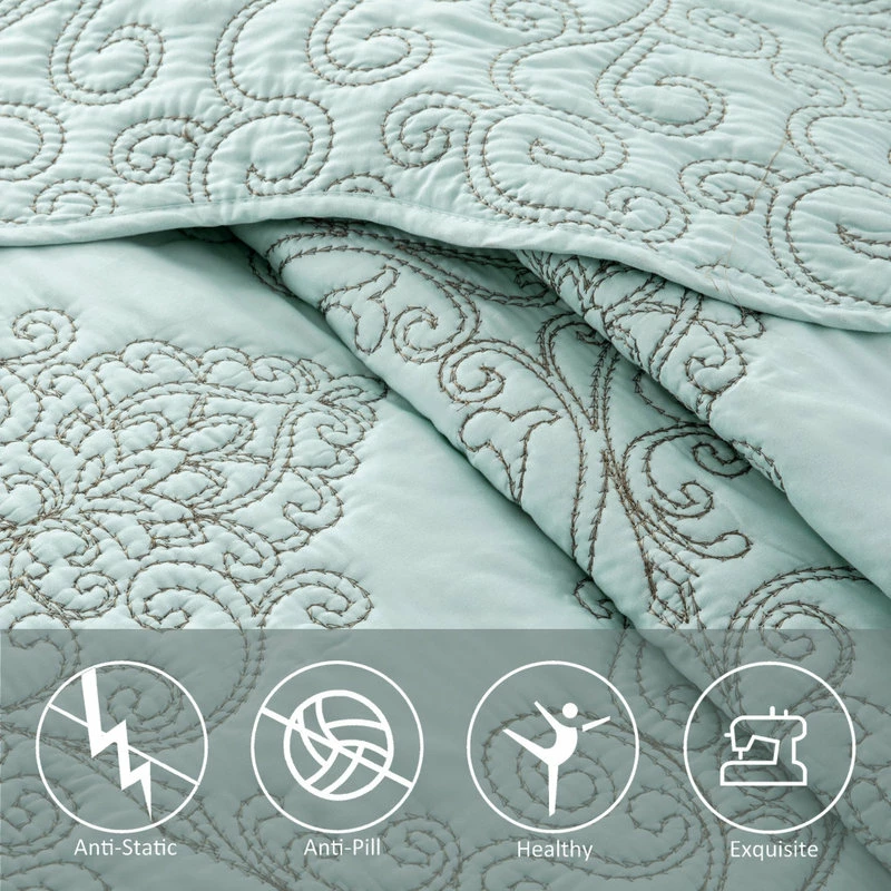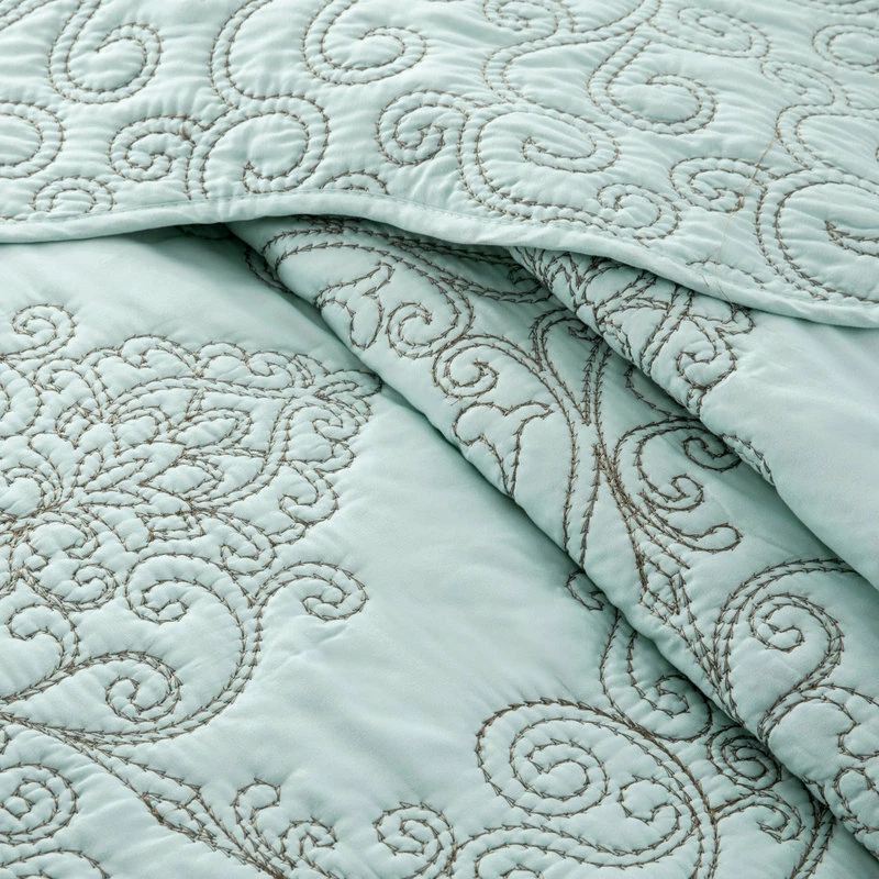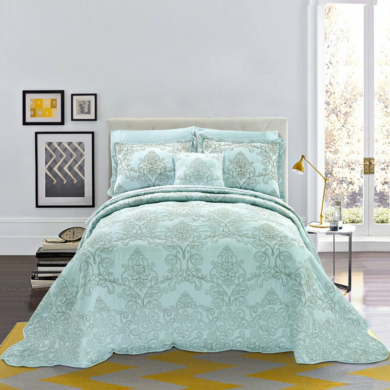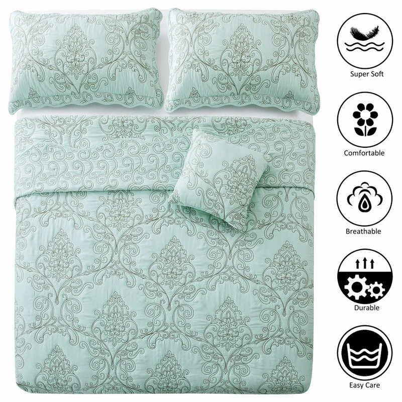 The queen-sized, light blue Damask Embroidered 4-Piece Quilted Bedspread Set comprises a bedspread, 16-by-16-inch throw cushion and two pillowcases, each beautifully made from ultra soft and durable microfiber fabric. Defined by its intricate embroidered detailing and quilted design, this set offers a luxurious light blue color, bringing an opulent yet unpretentious feel to your bedroom. Designed with warmth and comfort in mind, this four-piece set from BNF Home also makes a luxurious yet cozy statement in any home.