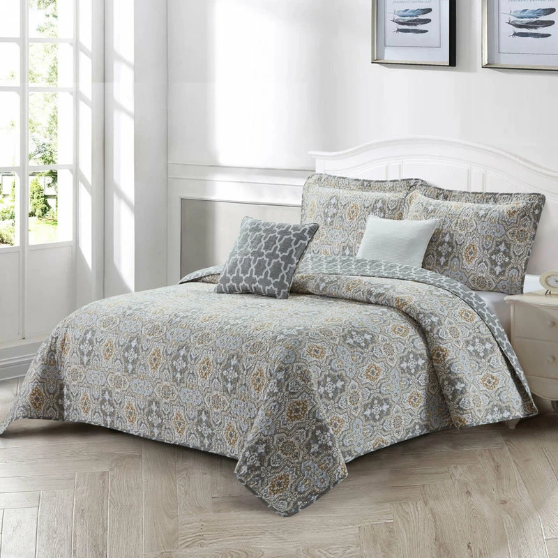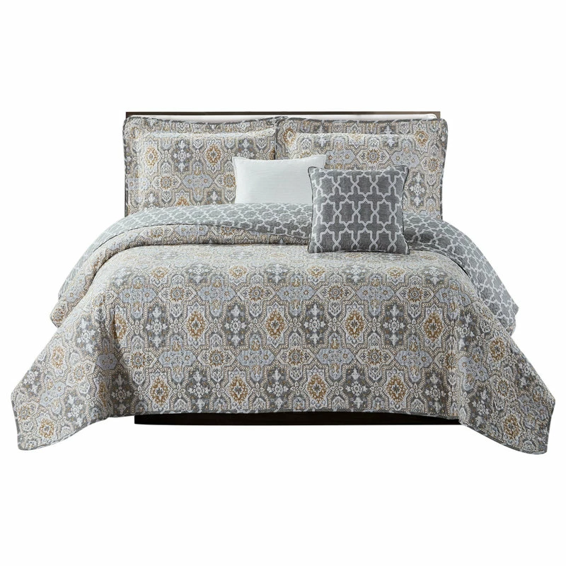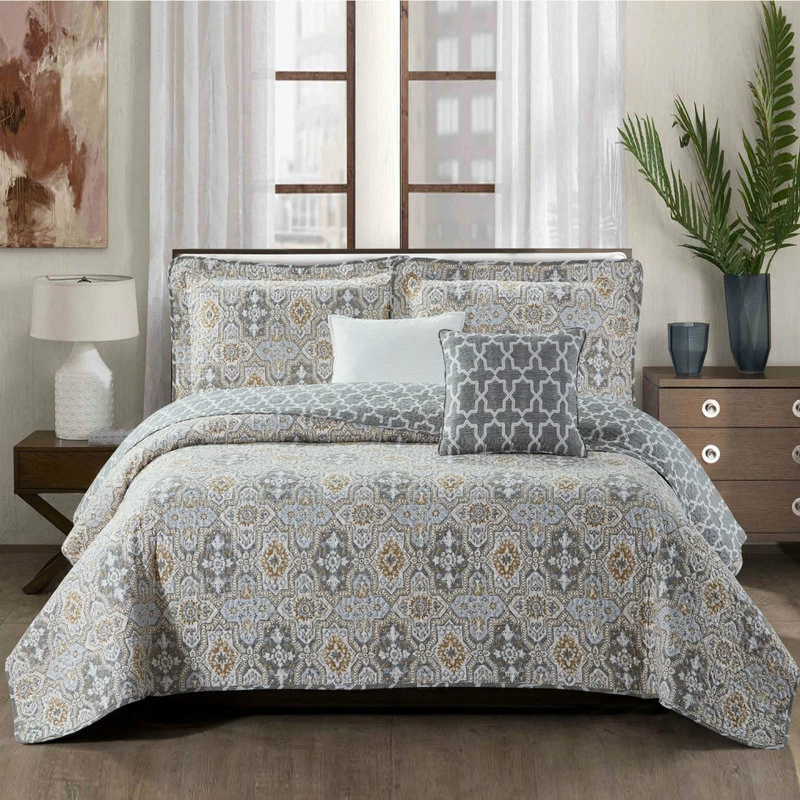 Outer Shell: 100% polyester Filling: 90% cotton, 10% polyester. Floral and geometric patterns drift across the uniquely designed Serenta Lanza Coverlet Set. With vermicelli quilting and straight-edged piping, you can float off into dreamland knowing you didn’t have to compromise on style to find comfort. Each 5 Piece Coverlet Set offers a reversible design and includes 1 Coverlet, 2 Matching Shams, and 2 decorative pillows. Dimensions: King Coverlet 102 x 90 in. King Shams 20 x 36 +2 in. Queen Coverlet 90 x 90 in. Queen Shams 20 x 26 +2 in. Decorative Pillows 16 x 16 in and 12 x 16 in. We recommend measuring your bed before purchase to confirm dimensions meet your sizing needs. Give the gift of relaxing slumber with a Lanza Coverlet set. Each piece is expertly folded then tucked together to perfectly fit into a reusable, zipper closure polybag with a full-color product card. With in-house manufacturing, we are your direct source to exquisitely crafted products at exceptionally low prices. With premium fabrics and fibers, meticulous stitching, and high-end designs your new home addition is built to last a lifetime when care tag instructions are followed. Machine wash your set separately in cold water using a delicate wash cycle. Tumble dry on the lowest heat setting to avoid heat damage. All our fabrics are heat treated for ultimate fade resistance and to become softer after each wash.