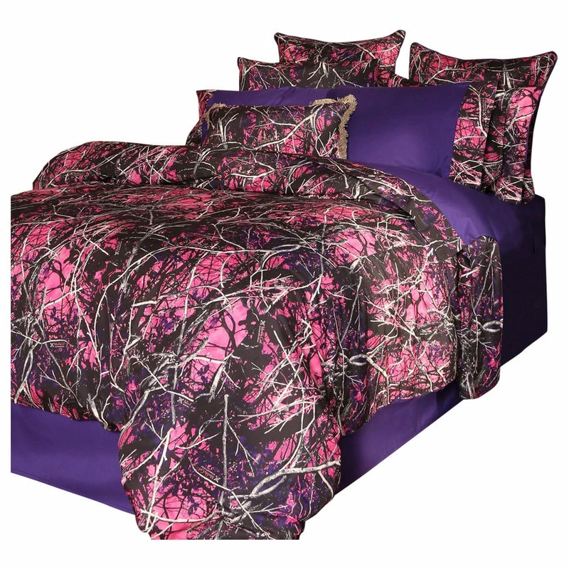 If you, re scouting for style, look no further than our new Muddy Girl Camo set, a bold, feminine statement for the rough-and-tough camo buff! Disruptively patterned branches stand out in sharp relief against a dark purple background, creating a wild and outdoorsy look. Combine with dark purple sheets and matching drapes, shower curtain, and valance to create a coordinating, unspoiled environment. When it comes to your terrain, don, t conceal your fashion zeal! Aim for Muddy Girl Camo, the perfect ammo.