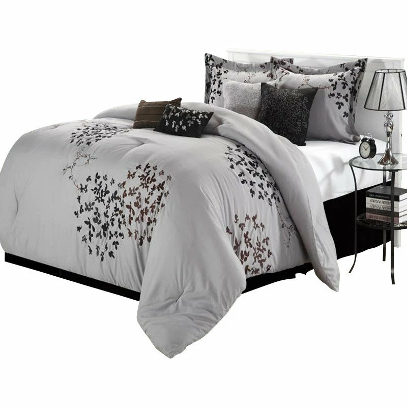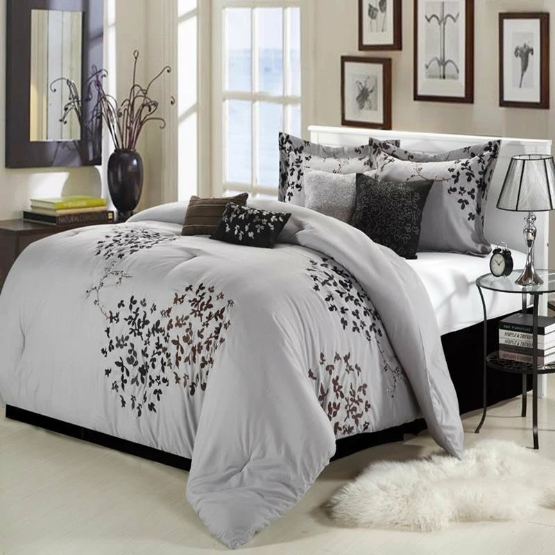 Your bedroom will look wonderful with this modern eight-piece comforter set as the focal point! The crisp gray background is beautifully complemented by delicate embroidered motifs in a contrasting black color. Your room will be transformed! One Comforter – (Queen 90 x 90 or King 110 x 90) One bedskirt – 14″ drop Two pillow shams – (Standard 20″ x 26″ or King 20″ x 36″) with a 2″ flange Four Decorative pillows 18 x 18 (2), 12 x 18, 9 x 12 All quality polyester microfiber Machine washable