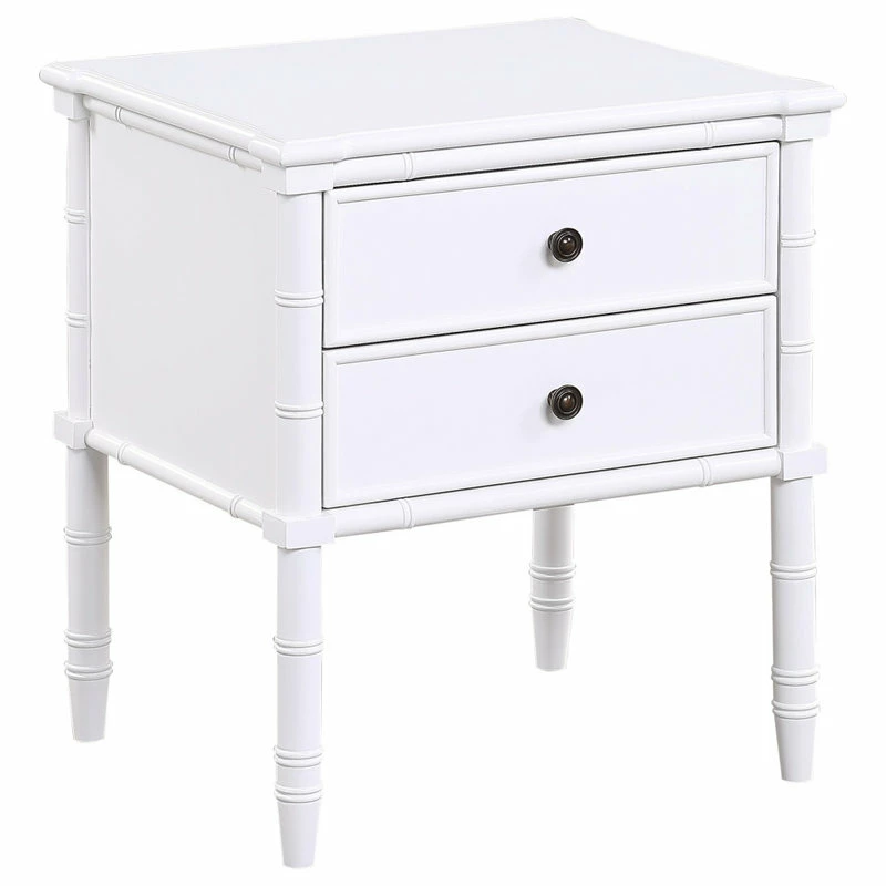 Bring a touch of the tropics to any room in your home with the Ellison nightstand. Your choice of midnight blue, white, or dove gray finish make it easy to add storage and style to any space. Two drawers offer corner block construction with side mounted roller bearing full extension drawer glides. A shaped top, framed drawer panels and elegantly carved bamboo style wooden legs make this table an easy addition to your bedroom, living room, entryway or office.