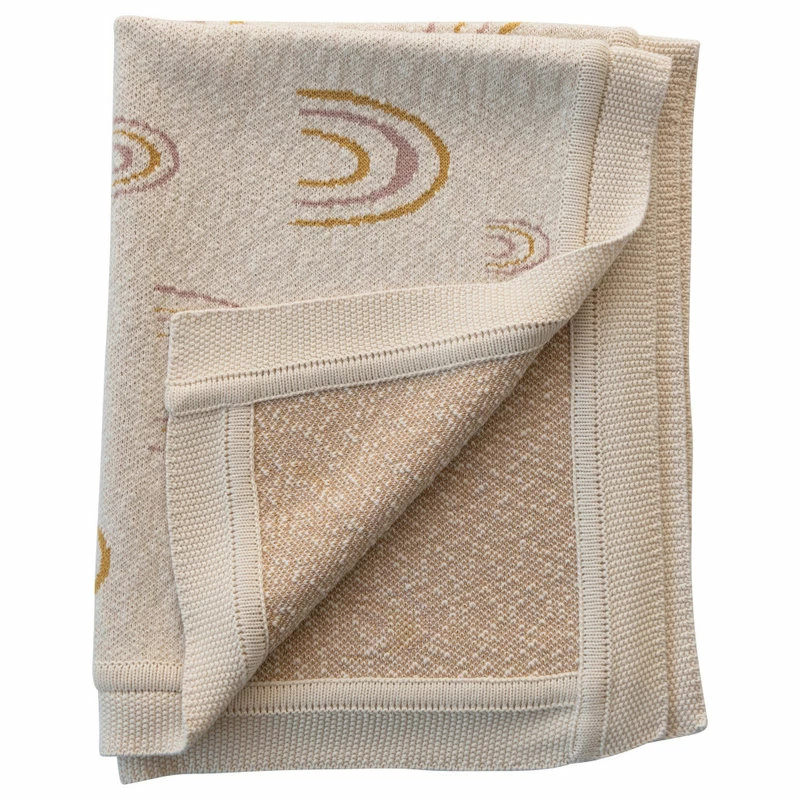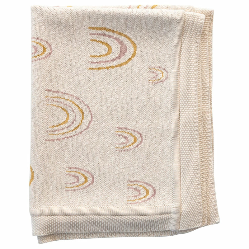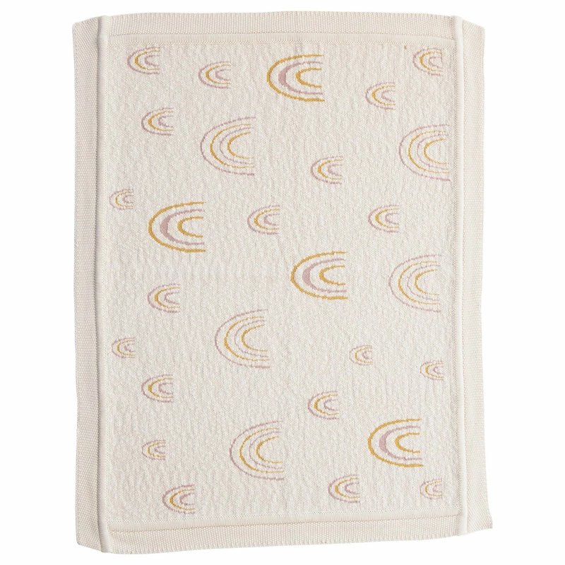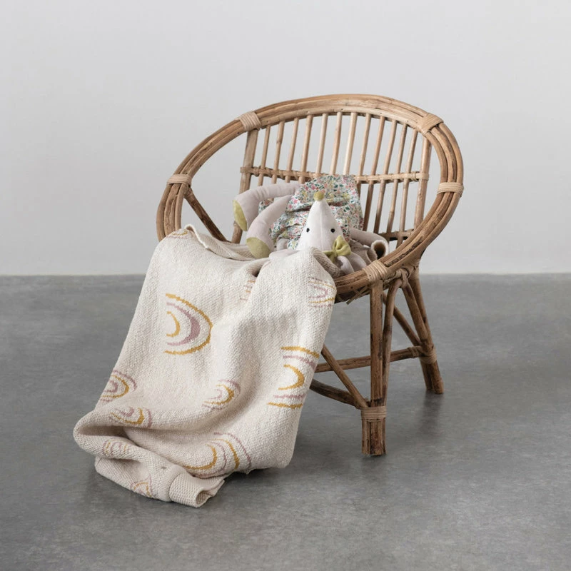This cotton knit baby blanket is perfect for nurseries, rocking chairs, or simply as d?cor. This soft blanket features a fun rainbow print with a beautiful cream color. This cute blanket is perfect for any new parent, and makes nurseries more comfortable and adorable