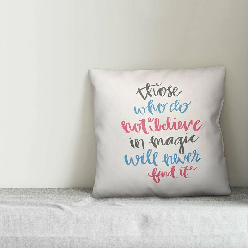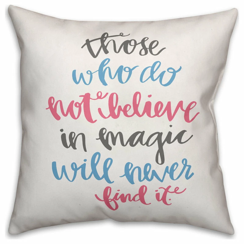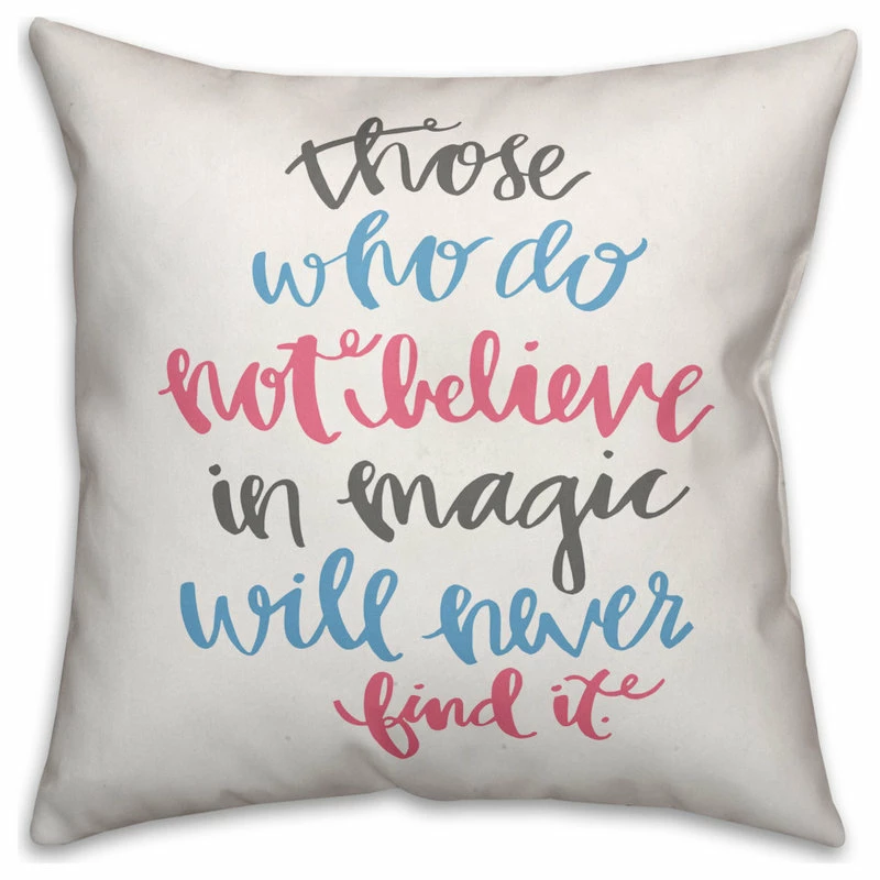 Spruce up your child’s room or nursery with this Those Who Do Not Believe In Magic 16×16 throw pillow by Designs Direct. The heavy weight stretch material provides great color definition and quality. The result is a fun design that is sure to add some personality to your little one’s space!