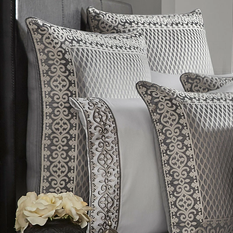The Euro Sham is casual yet sophisticated with its use of charcoal and cream colors. This beautiful sham is rich with a traditional woven scroll stripe border surrounding a lattice pattern center. This pillow sham reverses to a woven charcoal stria and is finished in 1/4″ piping and a hidden zipper. Pair this Euro Sham with the bedding set by Five Queens Court for a complete look.