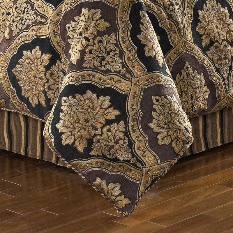 Reilly is a woven chenille damask. This bedding collection consists of shades of gold and black. The oversized comforter is embellished with tricolor twist cord. The 4 pcs set includes: One beautifully designed comforter. Two perfectly matched padded pillow shams with a hidden zipper. Pillow shams are engineered, centering the woven chenille damask and finished with tricolor twist cord piping. The bedskirt consists of an engineered woven chenille stripe. The bedskirt contains split corners and a 15″ drop. One (1) Comforter, Two (2)King Shams, One (1) King Bedskirt