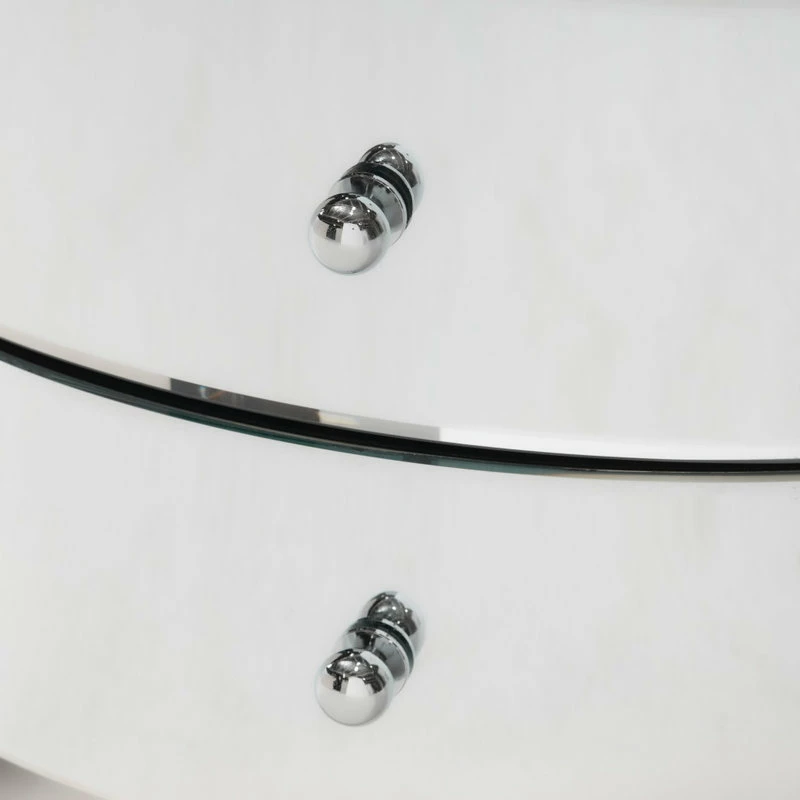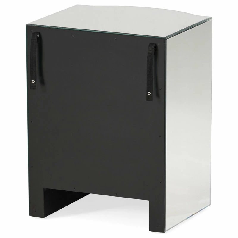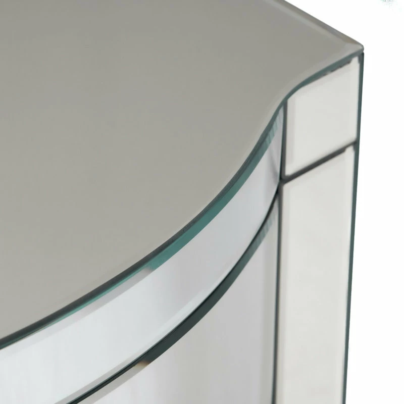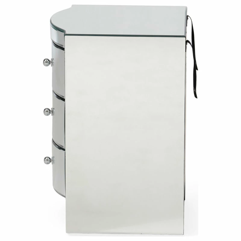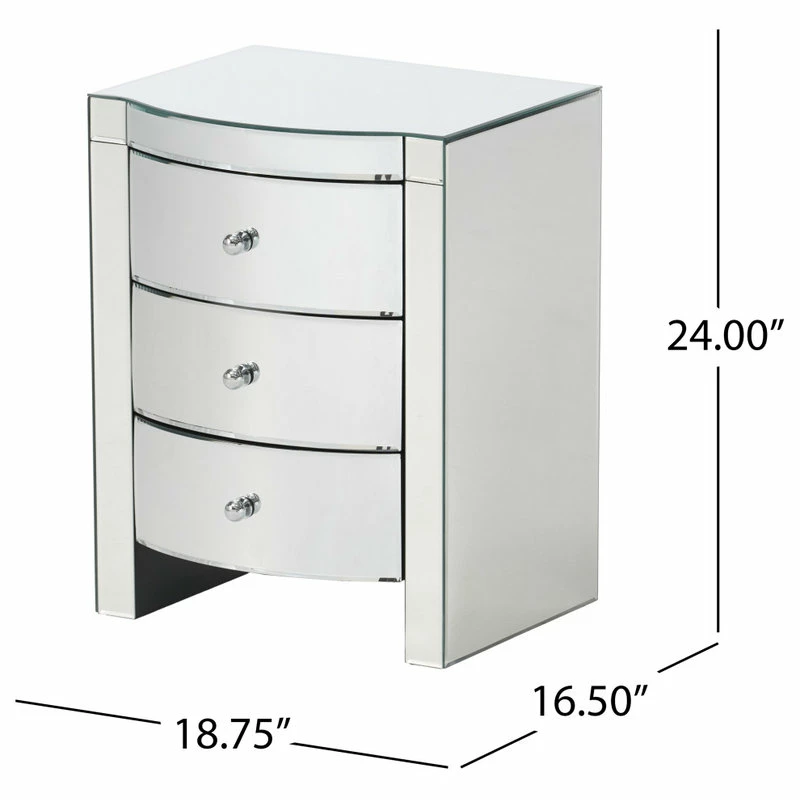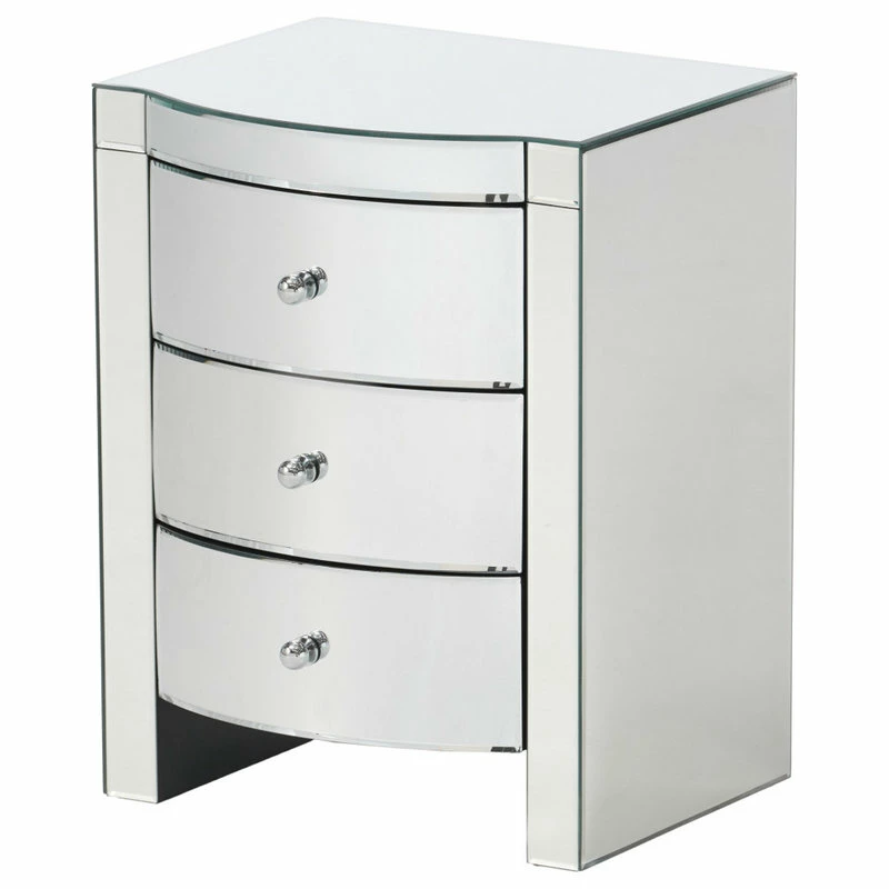 Give your home decor an elegant feel with this mirrored three-drawer side table. This unique side table doubles as storage and will modernize the surrounding decor with its’ innovative mirrored finish. Rounded mirror drawers and embellishments on the front of the side table create a statement that will last in any room you place it in.