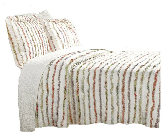 Ruffles of floral printed fabrics are carefully sewn to an off-white ground on the face of this frayed edge quilt, giving it a shabby chic look and feel. Eye-catching yet casual, this romantic style coordinates with a variety of colors matches a wide range of color themes. Oversized for better coverage on today’s deeper mattresses. Cotton face, back and fill. Prewashed and preshrunk. Machine washable.