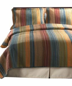 Chic and versatile, the Katy quilt set features a variety of warm and cool colors With a broad brushstroke of tasteful tones to compliment any bedroom theme, Katy reverses to a coordinating blue stripe Set includes: One Quilt, Twin One standard sized pillow sham, Queen/King two standard sized pillow shams Twin Dimensions: Quilt 68″x88,Sham 20×26”. Full/Queen Dimensions: Quilt 90×90”, Shams 20×26”. King Dimensions: Quilt 105×95”, Shams 20×36” each Cotton face, back and fill Prewashed and preshrunk, Machine washable Machine quilted with fabric bound edges for durability and surface interest Machine washable removable cover