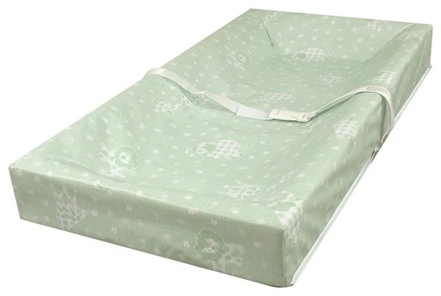 Playful baby Savannah animals printed on tough easy to clean non-toxic, water proof laminate. Polyester fiber-fill provides support during diapering time, while elevated sides and attached straps provide safety. Made in U. S.A.