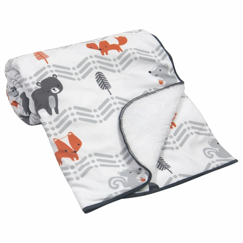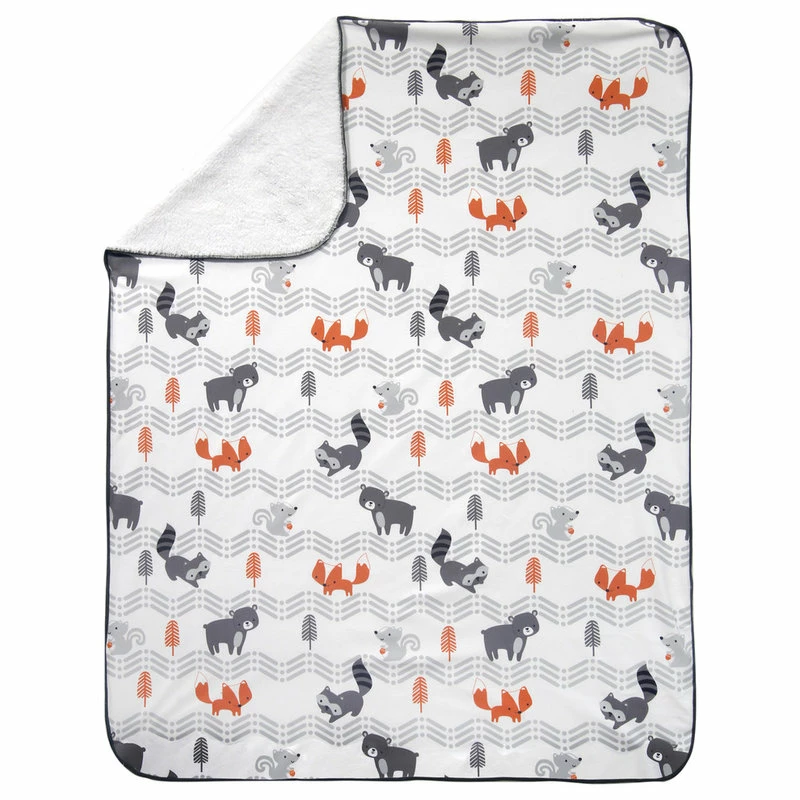 Favorite forest animals and trendy gray chevrons decorate this oh so soft baby blanket. The Sherpa back adds a wonderful cuddly texture. It measures 30” x 40” and is made of a soft polyester. Imported.
