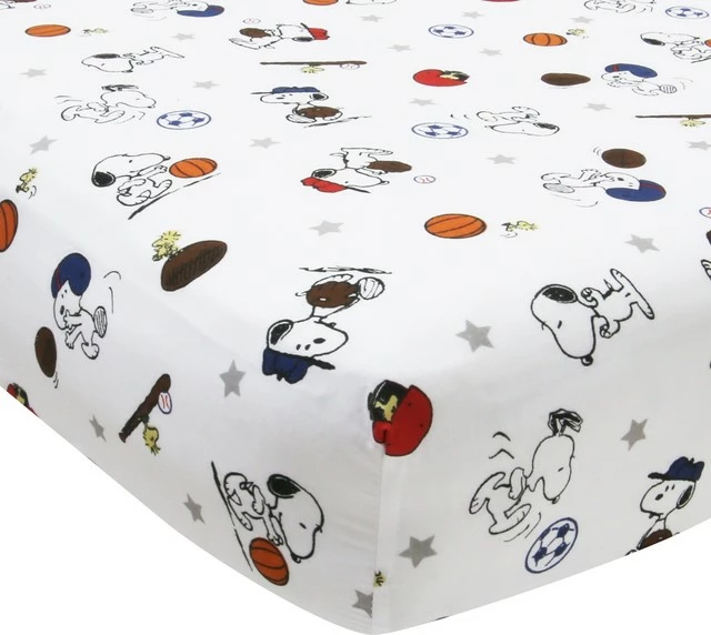 Our soft fitted sheet features Snoopy playing a variety of sports! Sheet will fit a standard sized 28″ x 52″ crib mattress and is made in a soft cotton/poly blend.