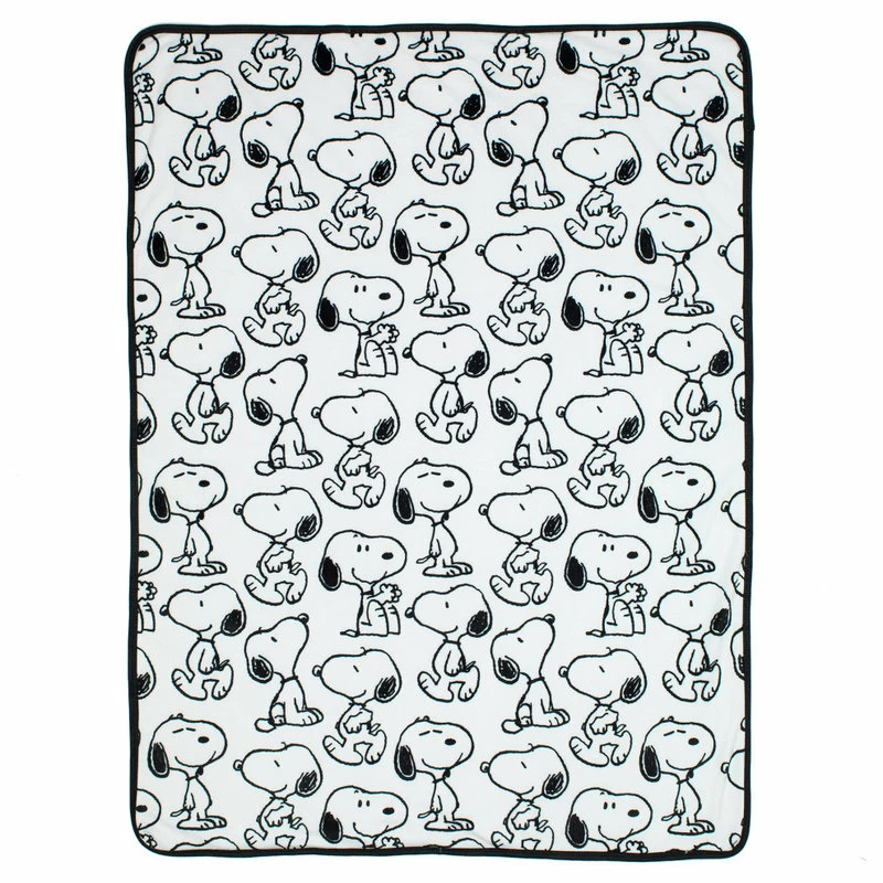 This soft minky baby blanket has a white sherpa back and will keep your little one warm and cozy. It features Snoopy in several of his favorite poses. The blanket is sized at 30” X 40” and is trimmed with a black binding. Perfect for using over a car seat or as a stroller blanket. A top baby registry pick and a great baby shower gift or welcome home baby gift.