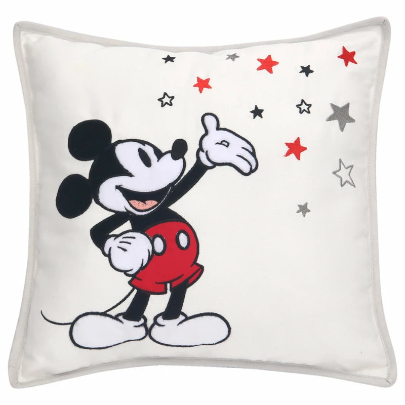 Celebrate Mickey Mouse with this charming cotton decorative nursery throw pillow. An 8 ½” appliqued Mickey stands tall on the left side admiring a handful of embroidered stars. The back of the pillow and binding is a gray twill fabric with white stars. There is an opening in the back for easy access of the poly filled cushion. The pillow measures 13” X 13” and has polyester fill.