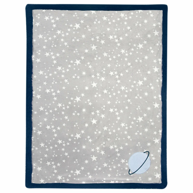 Spoil your little one with this super soft gray minky blanket decorated with multi sized white stars on the front and an oh-so-soft blue Sherpa on the back and border. The blanket is 30” x 40” and the lower right corner has an appliqued blue planet. Made to last, this blanket is polyester and is highly durable, retains its shape, resists wrinkles and is easy to care for. Imported.
