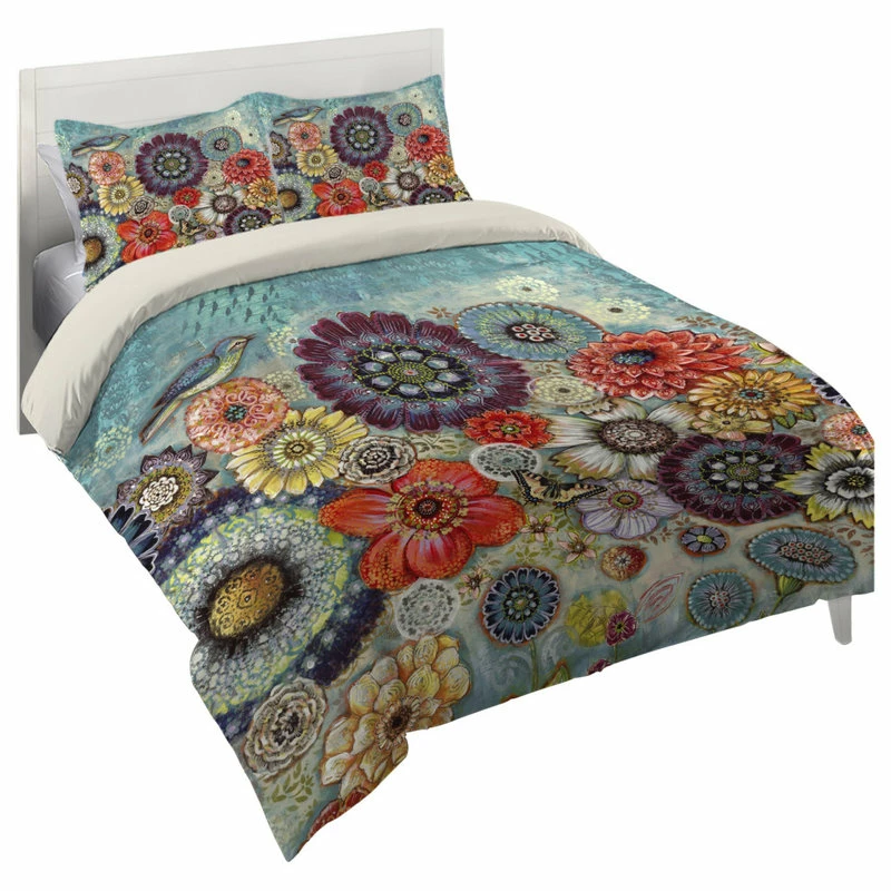 The “Blue Bird Boho Sham” features original artwork, hand painted on canvas. Detailed flowers, featuring a blue bird is the delightful sister to Boho Bouquet. This vibrant multi-colored work of art will brighten up any bedroom while adding a touch of bohemian flair.