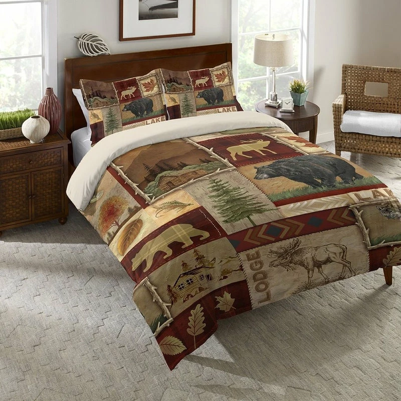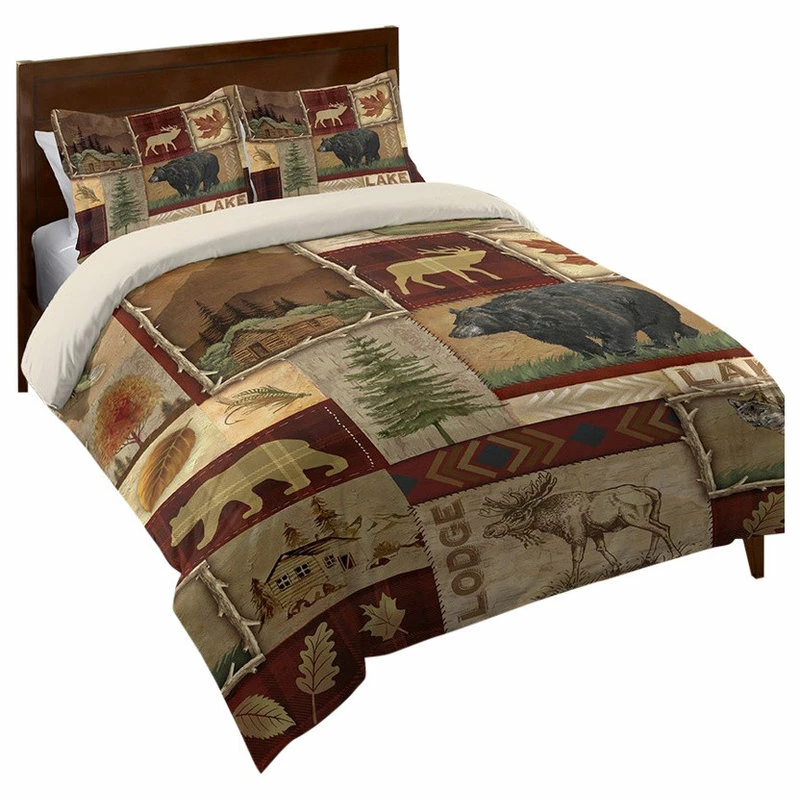 Bring the great outdoors into your home with the fun patchwork design of the Lodge Collage comforter. The rich earth tones of the playful, wilderness-themed imagery will complement and add warmth to any lake, lodge or cabin decor