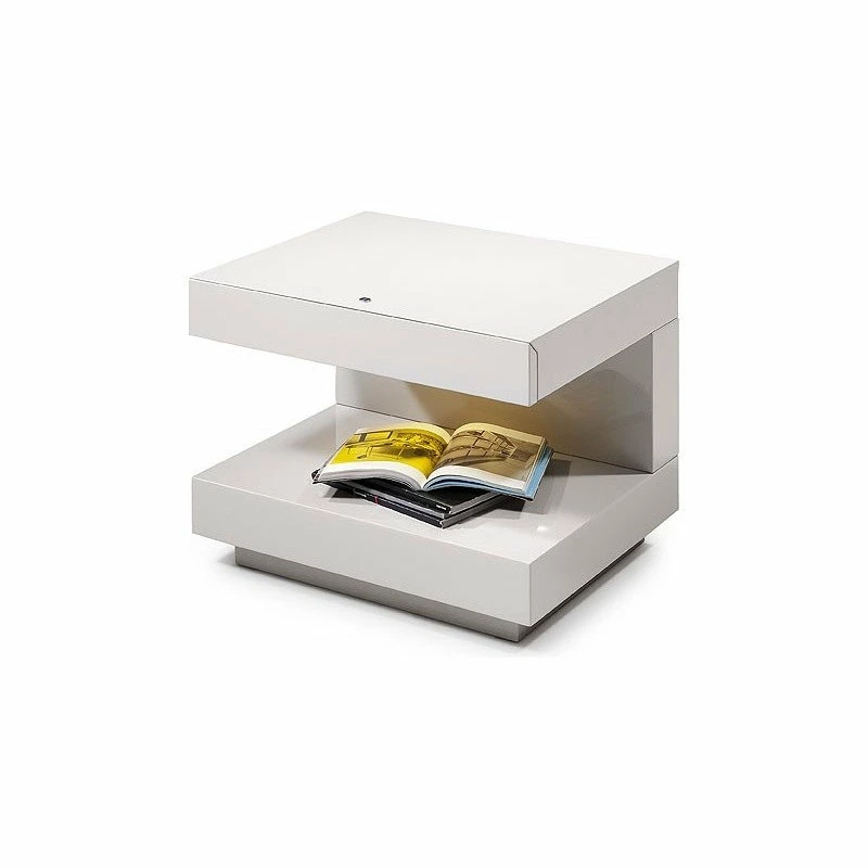The squared C-shaped silhouette of the Esso Nightstand is the perfect minimalist modern style. white gloss lacquer highlights the open shelving which keeps this design clean and contemporary. A hidden top pull-out drawer and touch sensor LED light adds functionality to this effortless piece. Also available in brown oak and gray.