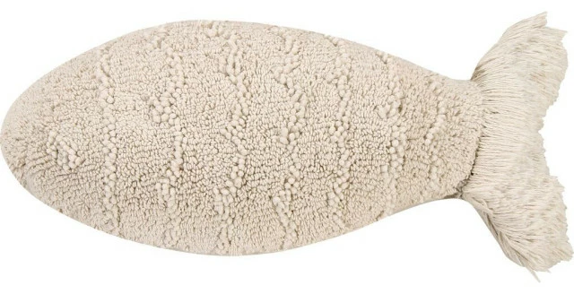 Its shape and blend of textures will make this fish a favorite with kids and adults alike! Washable cushion with fish-shaped outline and tightly-woven 100% cotton on the outside and with 100% polyester filling of the finest quality. The entire exterior has been previously dyed and on one side of the figure’s sides and cotton yarns have been applied using the chenille and loop technique to create a fish scale effect. Cotton yarns have been woven in the same colour to imitate a fish fin. This cushion is without doubt original and fits in with any kind of decoration and style – be it a kid’s room or play room or the living room or sofa or armchair. Discover the rugs from The Sea collection as well as the new blankets and wall hangings and give your home a revitalized look!