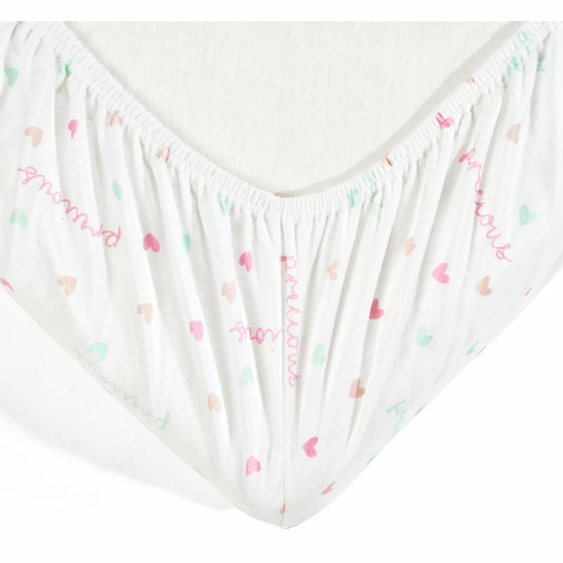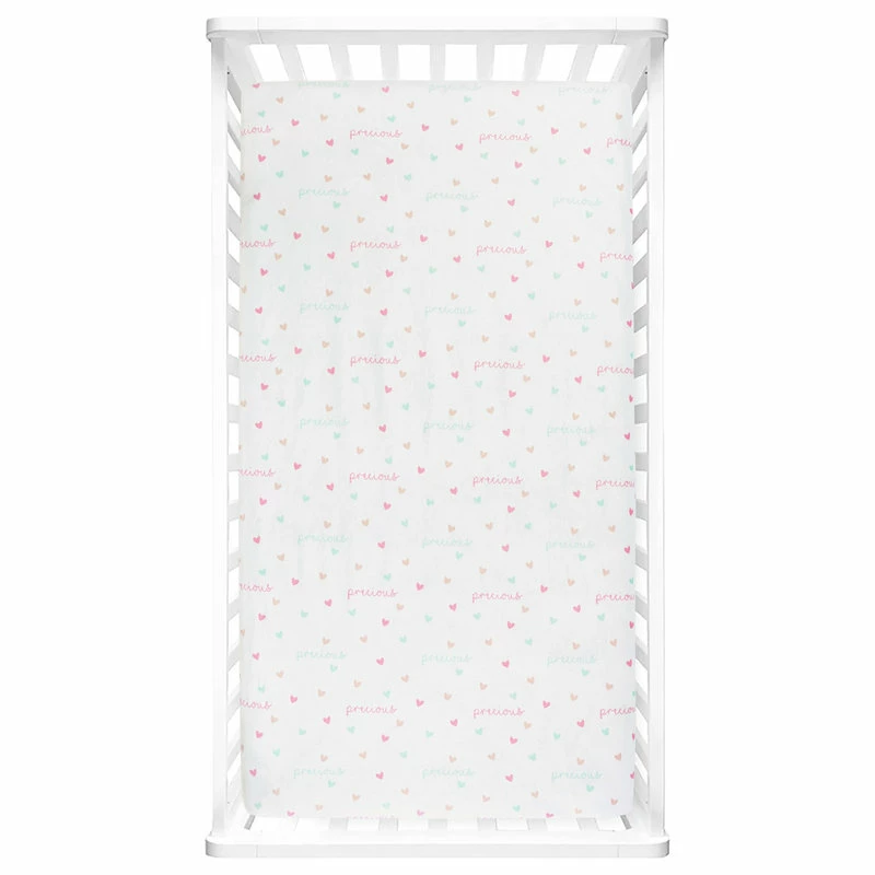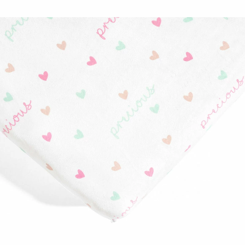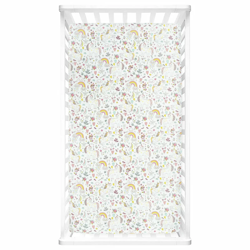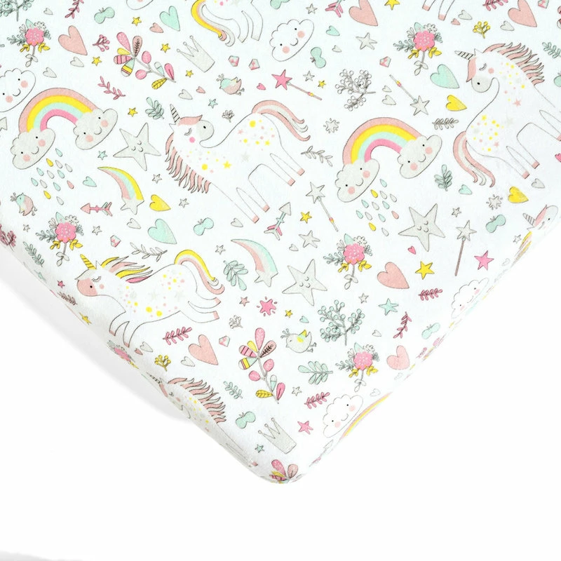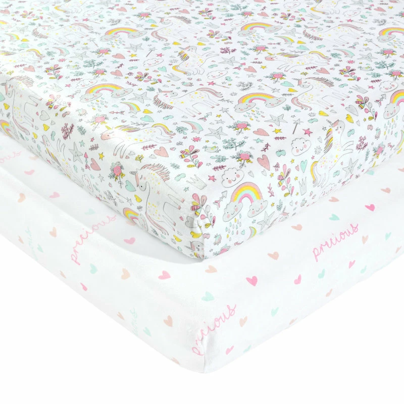 Unicorn Heart Rainbow Micro Mink Fitted Crib Sheet Multi 2Pk 28x52x9Unicorn Heart Rainbow Micro Mink Fitted Crib Sheet Multi 2Pk 28x52x9 – 16T007300 Design your nursery in a magical unicorn theme with this 2-pack set of fitted crib sheets in super soft Crystal Plush Micro Mink. These crib sheets are Standard 100 by Oeko-Tex Certified so you can feel comfortable laying your baby down on them. We have enhanced our products for your health and well-being. This item is STANDARD 100 by OEKO-TEX certified, which means the fabric, dye and all components have been tested in an independent laboratory and certified against a list of more than 350 harmful substances. You’ll probably have to change your fitted crib sheet often, so we offer this adorable two-pack to allow you to keep a clean one on hand while you wash the other. This set also allows you to mix and match these coordinating styles. One of the fitted crib sheets features a printed design of unicorns and rainbows. The second fitted crib sheet has a colorful heart pattern. This subtle pattern makes it easy to coordinate with the rest of your nursery decor. Each of the Crystal Plush Micro Mink fitted crib sheets in this two-pack set measures 28inW x 52inH with a 9in Drop. The elastic band helps keep it securely in place. Please refer to the care label for full instructions before cleaning.