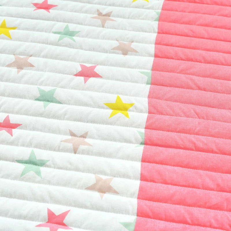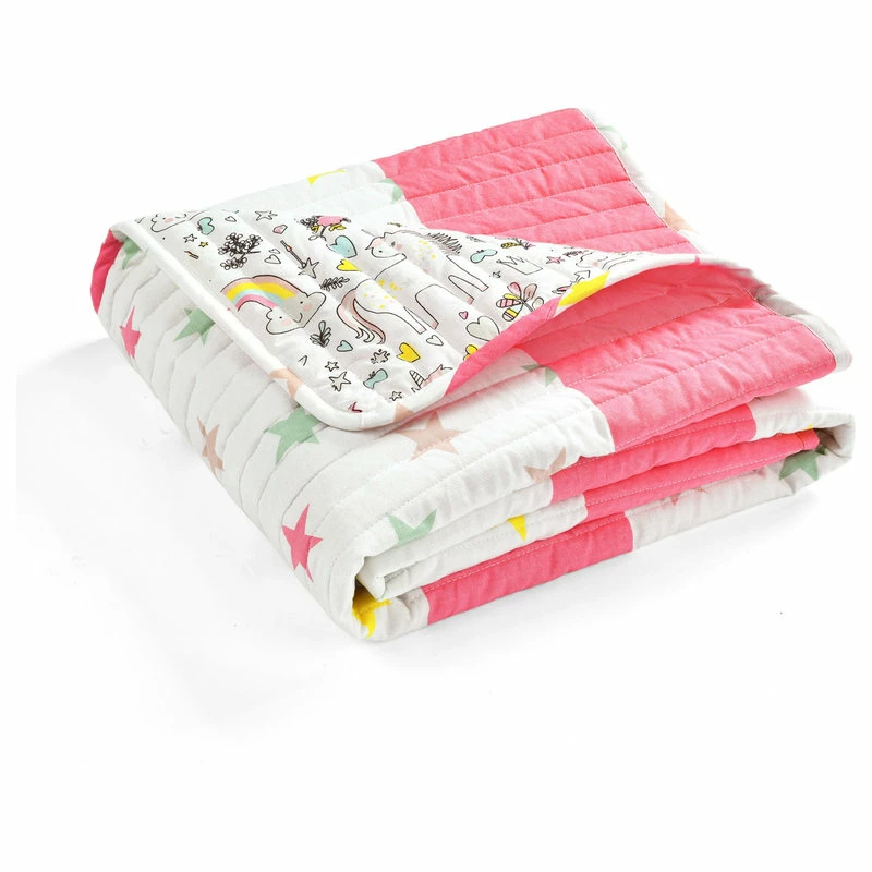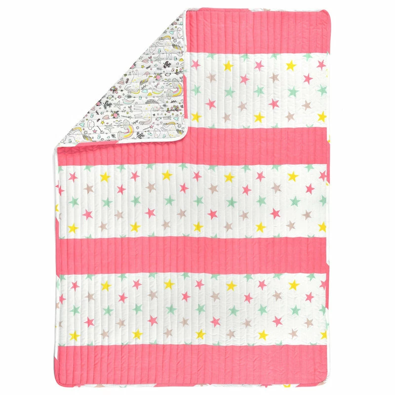 Unicorn Heart Rainbow Organic Cotton Quilt Multi Single 36x50Unicorn Heart Rainbow Organic Cotton Quilt Multi Single 36×50 – 16T007322 This organic cotton baby quilt features a print of colorful stars and stripes on the front, and unicorns, rainbows, and more on the back. Its two great looks for one low price. This item is both Standard 100 by Oeko-Tex Certified and GOTS Certified. We have enhanced our products for your health and well-being. This item is both GOTS and STANDARD 100 by OEKO-TEX certified. GOTS is the worldwide leading textile processing standard for organic fibers backed by independent certification of the entire textile supply chain. This certification means that the processing, manufacturing, packaging, labelling, trading and distribution of all textiles are made from at least 95 percent certified organic natural fibers. STANDARD 100 by OEKO-TEX certified guarantees the fabric, dyes and all components have been tested in an independent laboratory and certified against a list of more than 350 harmful substances. Rest assured that this product is truly organic and sourced only from green supply chains.This 100 percent organic cotton baby quilt measures 36in wide by 50in long to fit well in most cribs and to transition easily to a toddler bed. Because this baby quilt is reversible, you get two great looks in one affordable package. And when youre ready to change the look in your babys room, you can simply flip it over to the other side. For your convenience, this item is safe to machine wash.