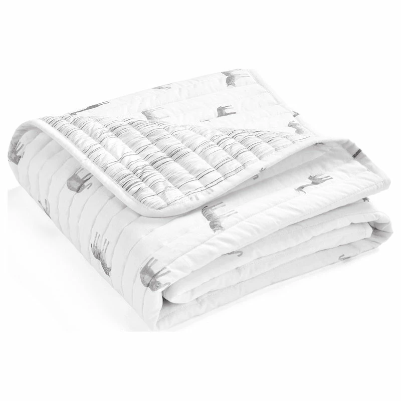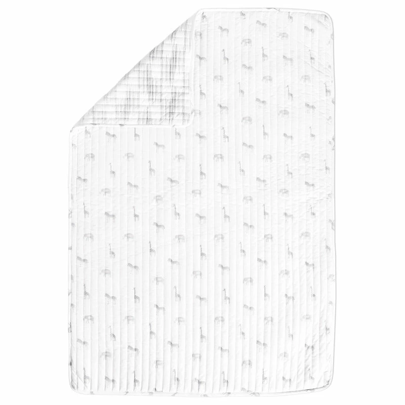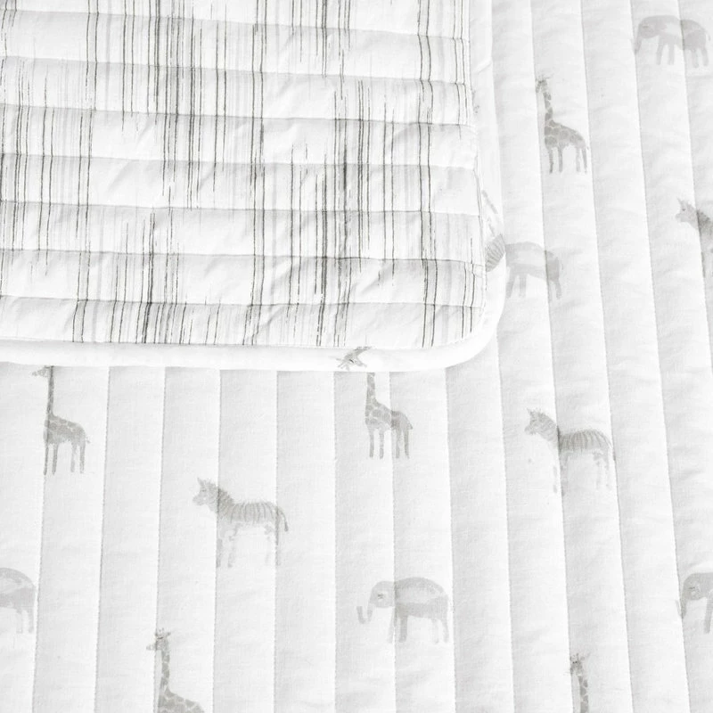 This reversible organic cotton baby quilt features a print of elephants, giraffes and zebras on the front, and a geometric print on the back for two great looks at one low price. This item is both Standard 100 by Oeko-Tex Certified and GOTS Certified.1 Quilt: 50″Hx36″W