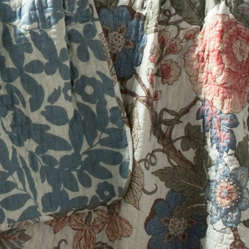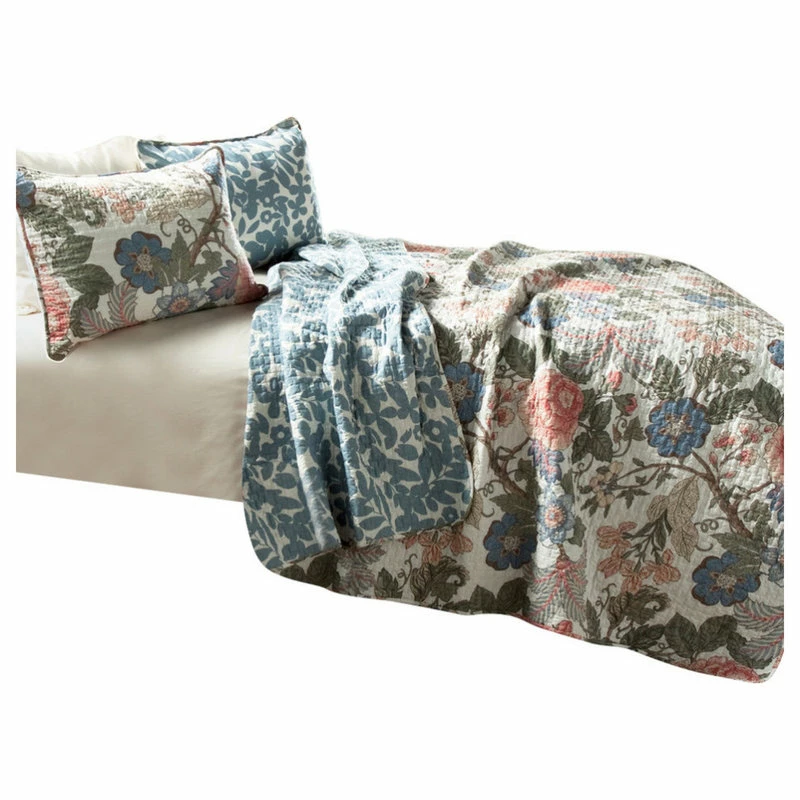 Soft yet distinct flower pattern enhances the blue solid design on the reverse of the quilt. This 3Pc quilt will complete any country cottage bedroom. The matching reversible shams allow for creativity and changeability of the immediate feel. Made from 100% cotton, this set is soft to the hand and has wonderful quilting details. Imported.