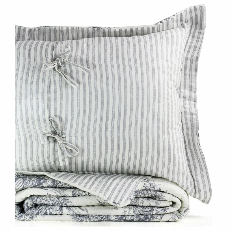 These 100% Cotton ‘Toile’ Printed Quilts and Sham Pair separates are the perfect combination to add a layer of style and light weight warmth to your bed! The ‘Toile’ pattern is printed in beautiful colors and is classic and sophisticated on the neutral ground on the quilt and shams! The elegant ‘Plaza’ stitch pattern runs throughout the quilt and shams. There are two tie-closures on the back of the shams!