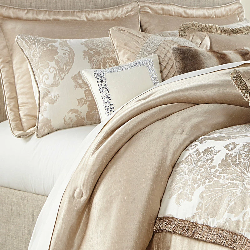 Give your room an updated and elegant style with the Palermo comforter set! The comforter and shams reverse to a solid crème fabric, while the bolster pillow and bed scarf feature a beautiful large-scale jacquard frame in elegant, neutral tones. Traditional details blended with contemporary fabrics create pillows that step away from the usual, and into the unique. The pillows have removable covers and waterfowl feather fill.