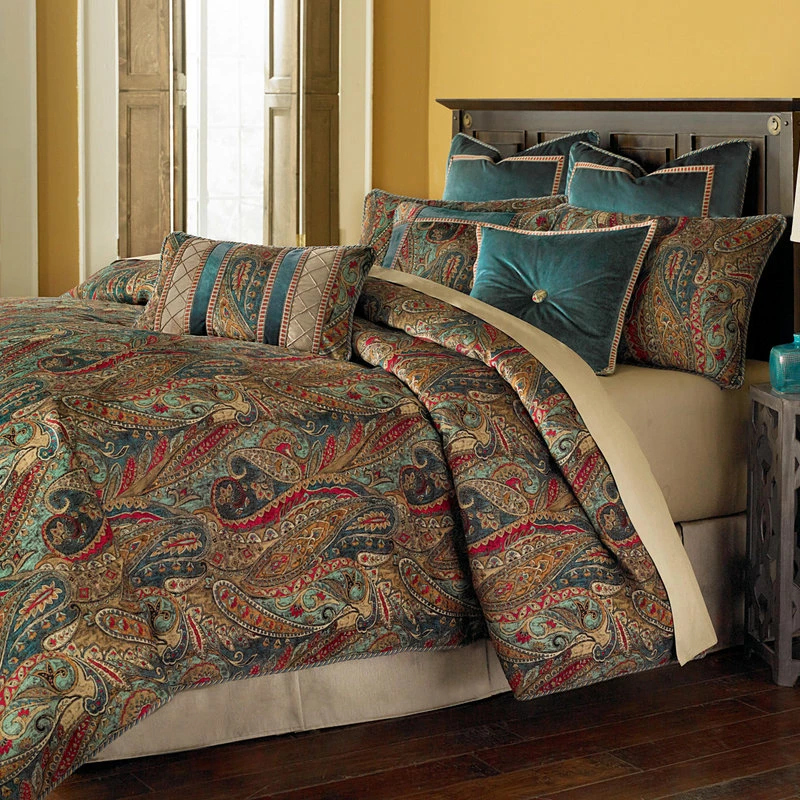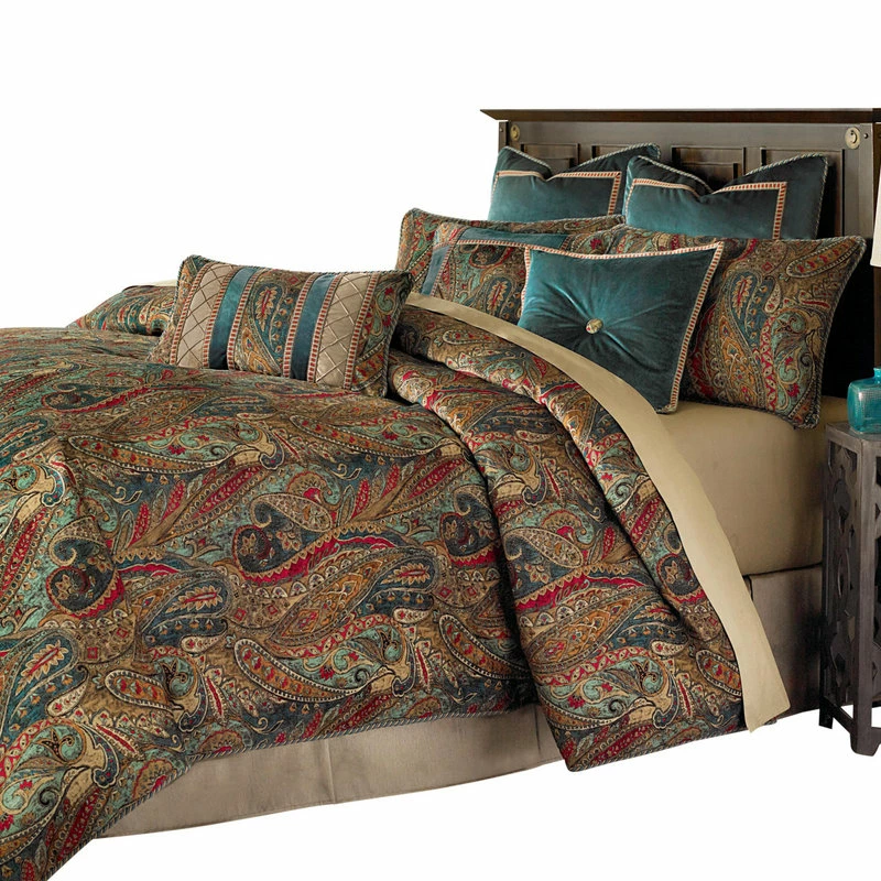 The Seville comforter set is ready to enhance your classic style! This bedding showcases a blend of rich jewel tones and bold paisley pattern on a soft velvet ground. Teal velvet and pin tucking details on the decorative accessories tie the look together. The over-sized, over-filled comforter adds more luxury to the bedding. The decorative pillows have removable covers and feather fill.