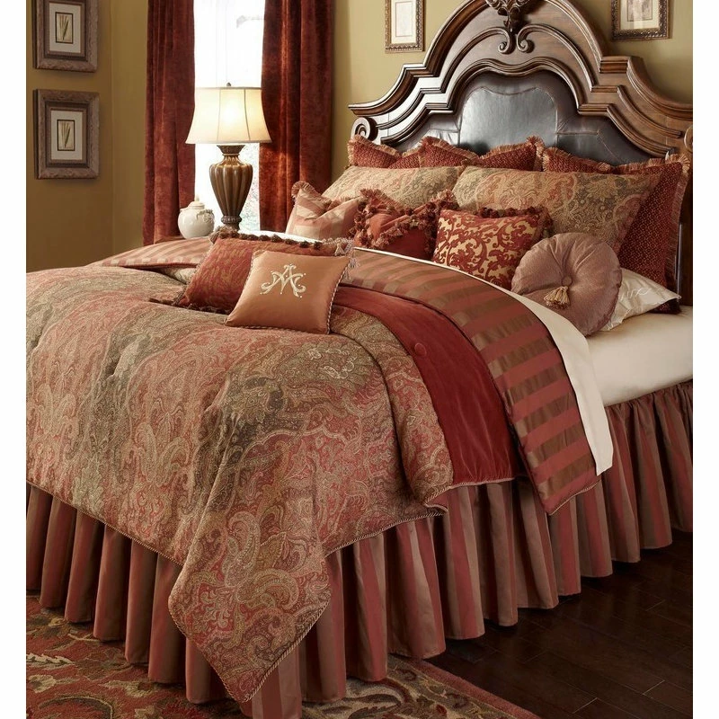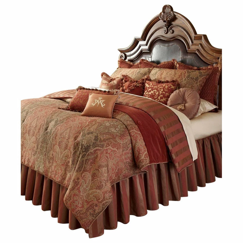 The Woodside Park Comforter Set by Michael Amini features a beautiful paisley mixed with velvet that embodies all that you love about the English country manor style. The oversized stripe on the adjustable bedskirt, with a 21″ drop, and comforter reverse, add a bit of whimsy. The chenille jacquard euros shams have brush fringe accent trim. We have spared no expense on the details. Included are 6 decorative pillows, one a jaguar chenille, and of course the Michael Amini signature pillow. Enhance any bedroom with this traditional ensemble.