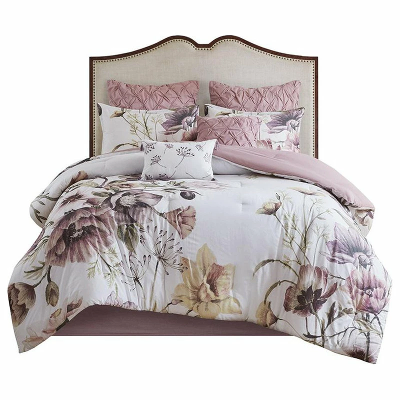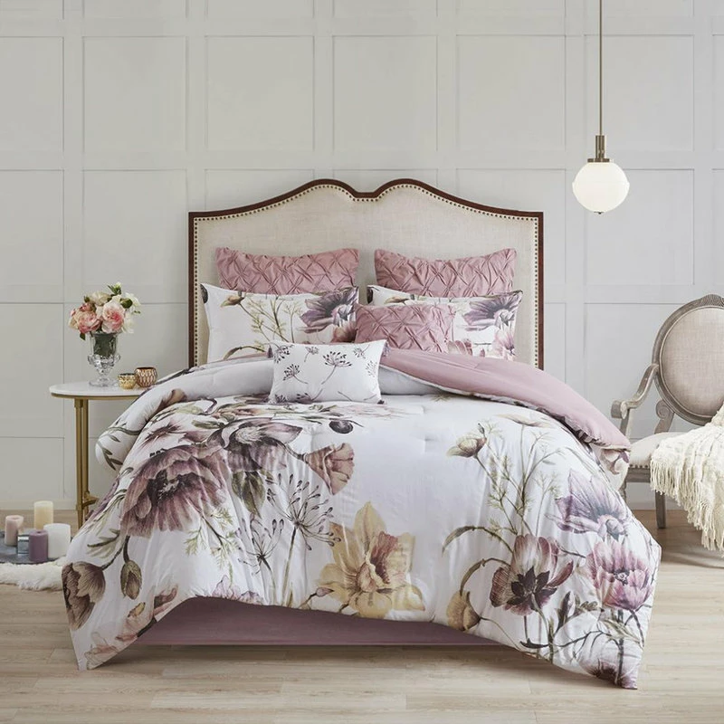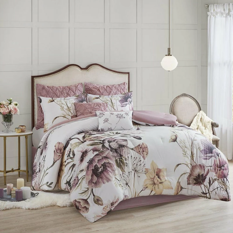 The Madison Park Cassandra 8 Piece Cotton Printed Comforter Set offers a beautiful shabby chic update to your bedroom. The cotton comforter and shams feature a large floral print, in soft blush hues, creating a gorgeous look. Two Euro shams coordinate with the comforter set, while two decorative pillows with embroidered and tufted details provide the finishing touches. With its romantic color combination, this shabby chic comforter set brings a soft allure to your bedroom. This bedding set is OEKO-TEX certified, meaning it does not contain any harmful substances or chemicals to ensure quality comfort and wellness.