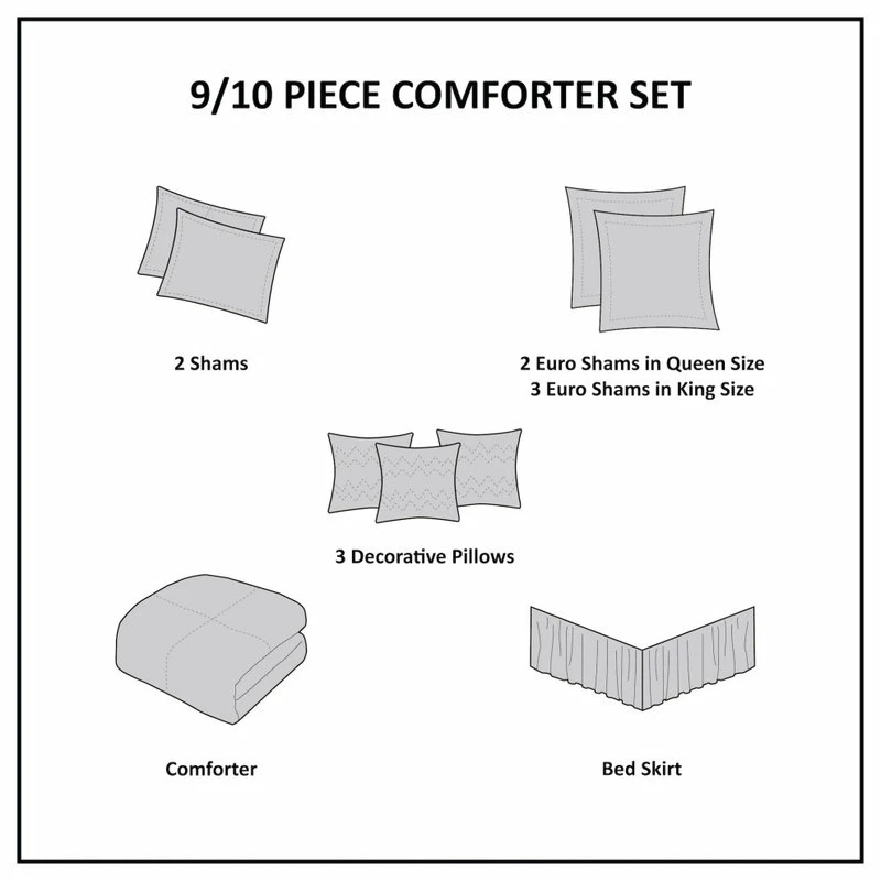 - Set includes comforter, 2 shams, 2 euro shams (3 in King size), 3 decorative pillows, 1 adjustable bed skirt