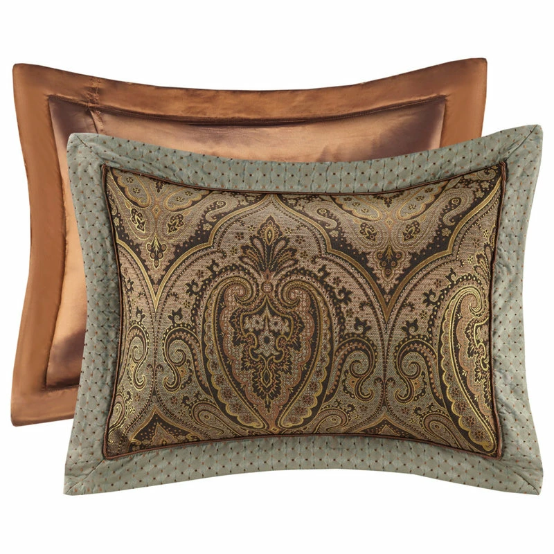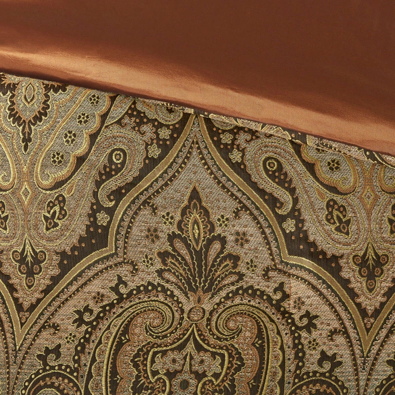 Sleep well in this exquisite Hampton Hill Canovia Springs Jacquard Comforter Set. This beautiful comforter set features an all over medallion jacquard design in rich colors of blue and soft brown in a unique weave to let the pattern shine. This oversized comforter includes 2 matching shams and a coordinating adjustable bed skirt to create a luxurious traditional look. Also included are 2 Euro shams (3 in King) that gorgeously pair with the comforter, while 3 decorative pillows provide the finishing touches to complete this grand bedding set. Simply stunning, this comforter set offers a gorgeous combination of luxurious style and comfort to elevate your bedroom decor. Dry clean only. Matching window panels and valances are also available and sold separately.