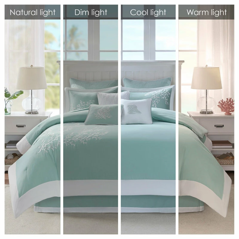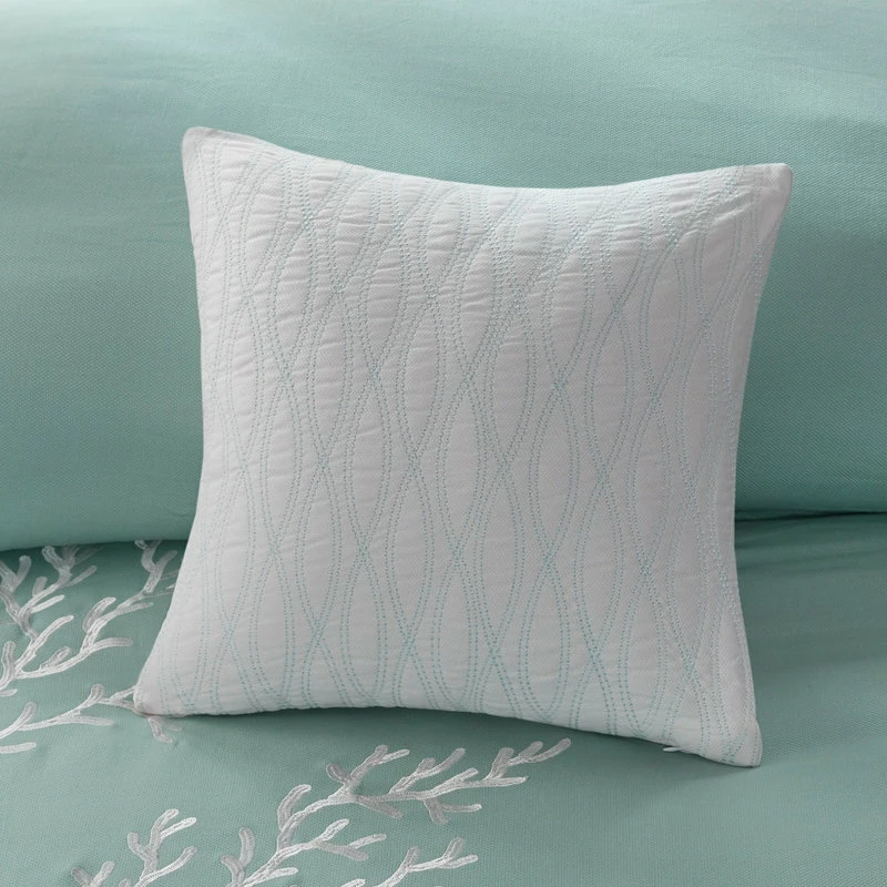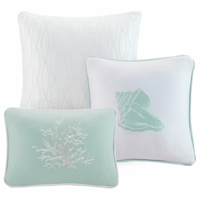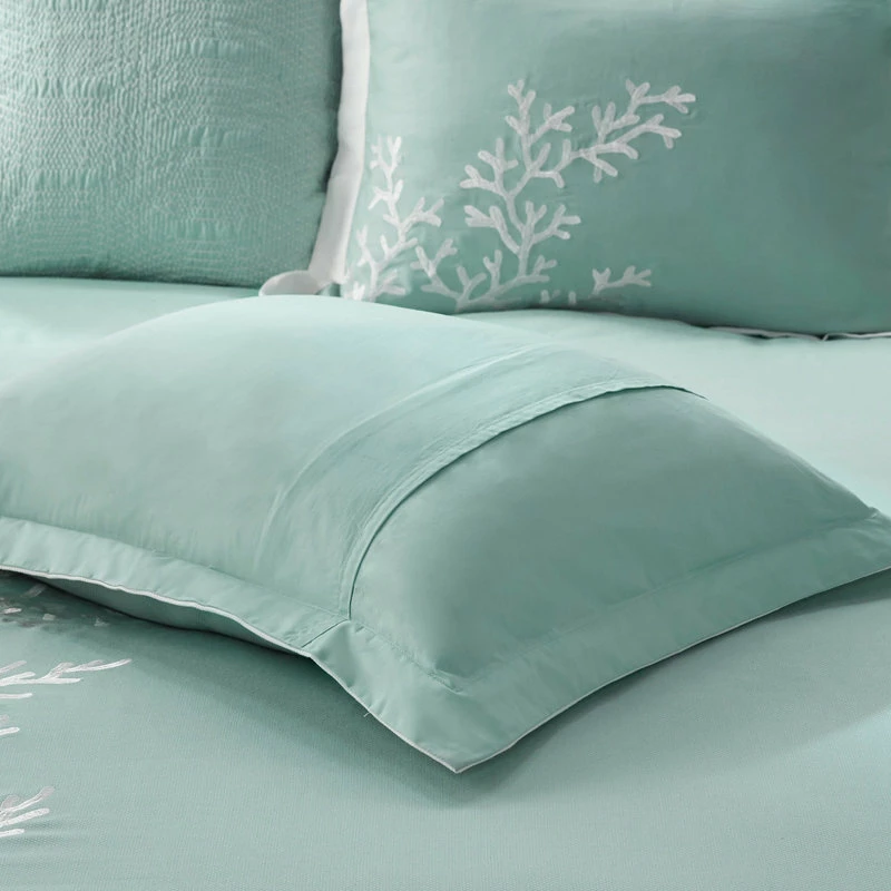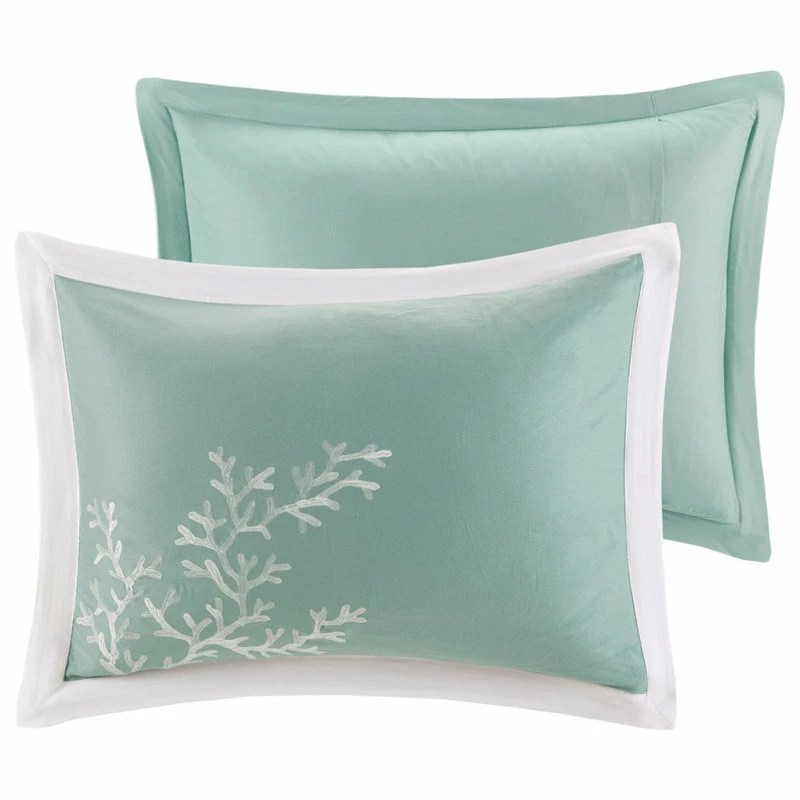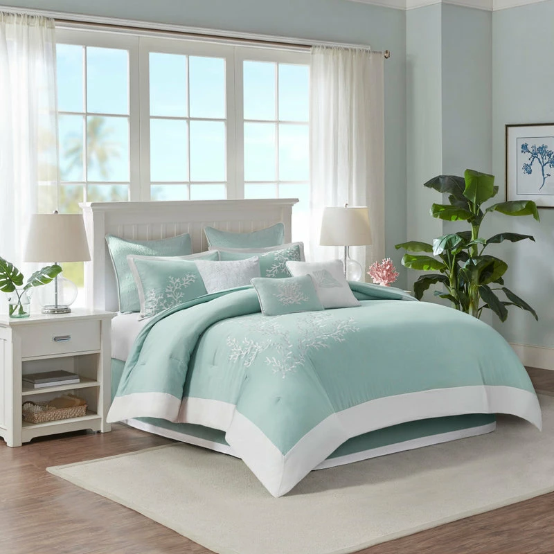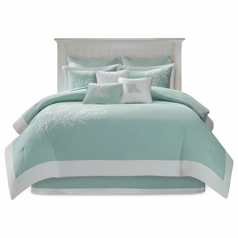 Bring a bit of sea side inspiration into your home with this beautiful bedding collection. The Harbor House Coastline collection features an intricate white coral motif embroidered on an aqua background finished with a pieced white border. Oversized and overfilled, this comforter set is made of 100% cotton with polyester filling and offers warmth and comfort to your room. Included in the set is one comforter, one border-style bed skirt, and two shams (1 for Twin size). Top off the look even more with the accessory items – Euro shams and decorative pillows which are sold separately. For best care, dry clean the comforter, shams, and bedskirt. This bedding set may come in rolled or compressed packing and will need to be fluffed up.