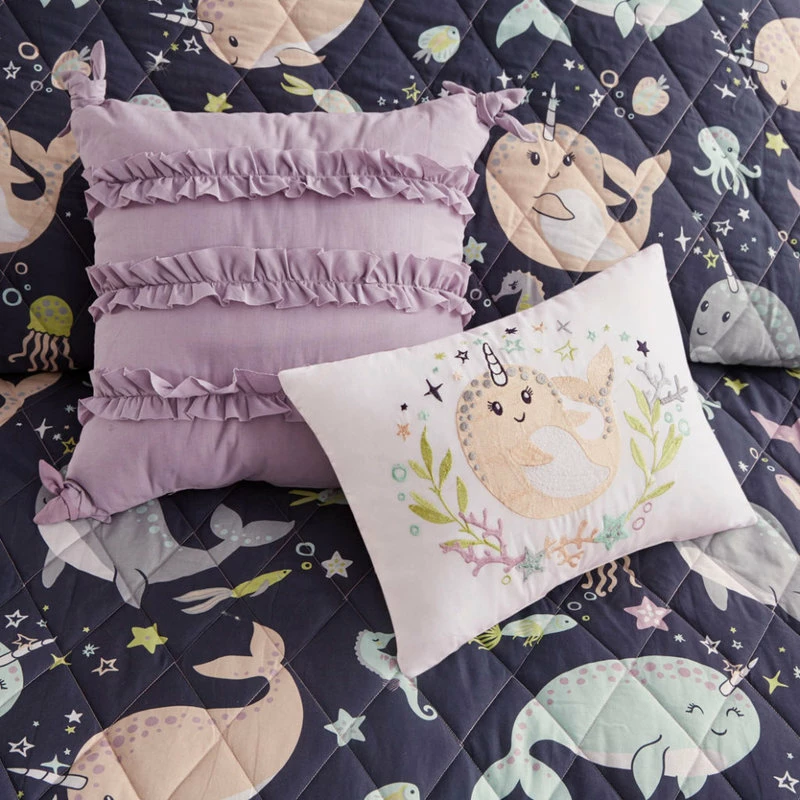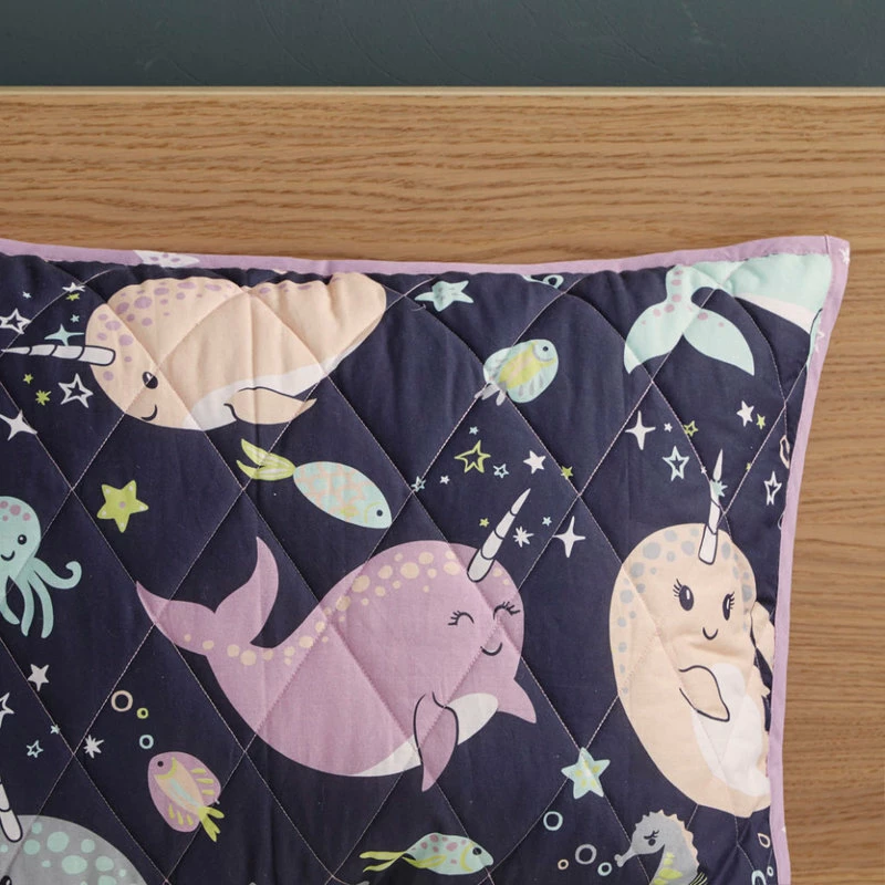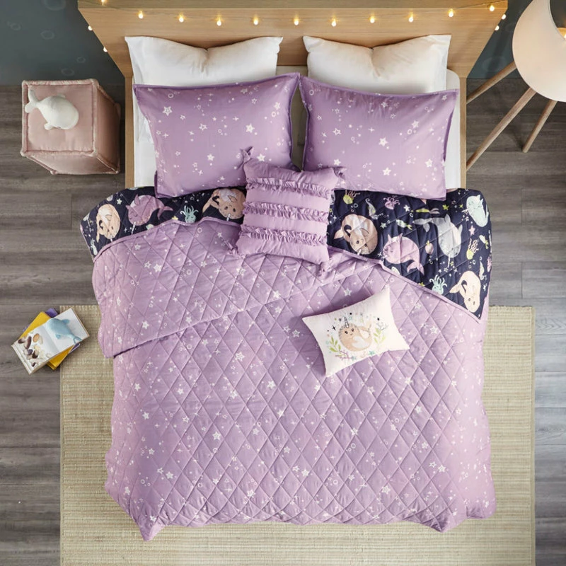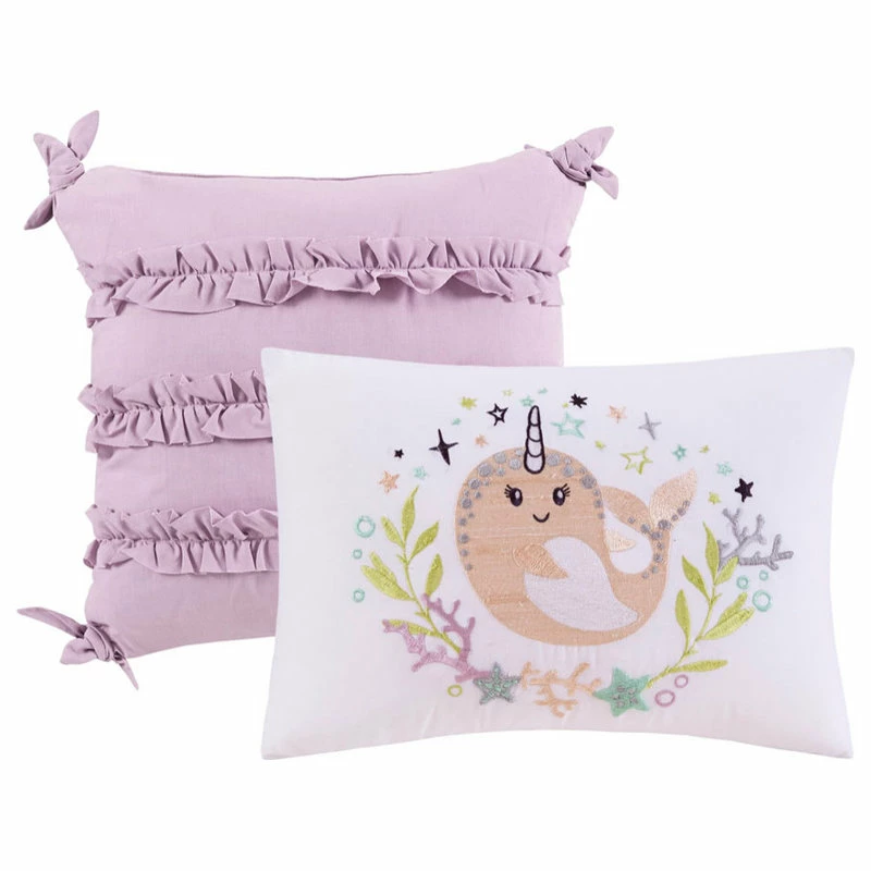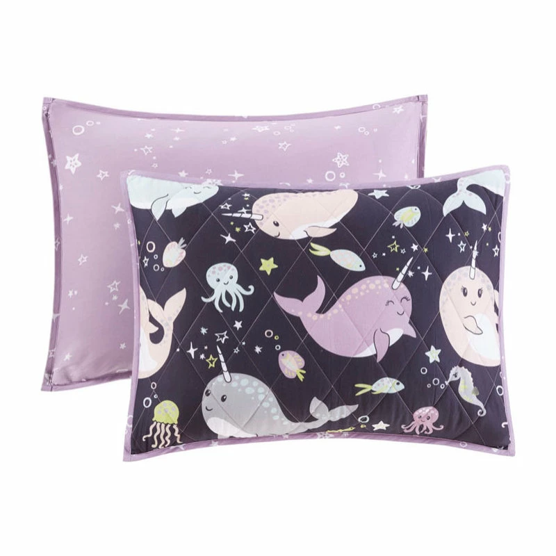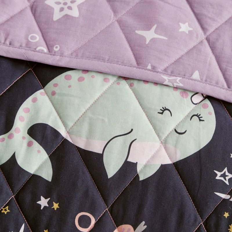 The cotton comforter features a cute narwhal print in soft colors that flips to a star print on the solid reverse. Machine washable for easy care, this kid’s comforter set is sure to brighten your child’s bedroom with a fun and adorable look.