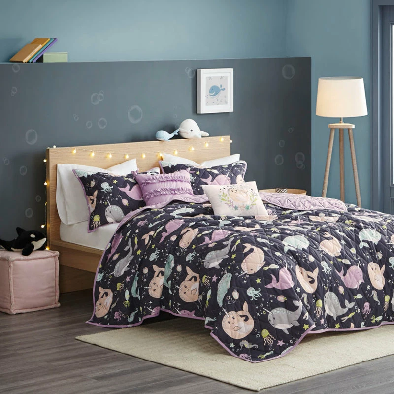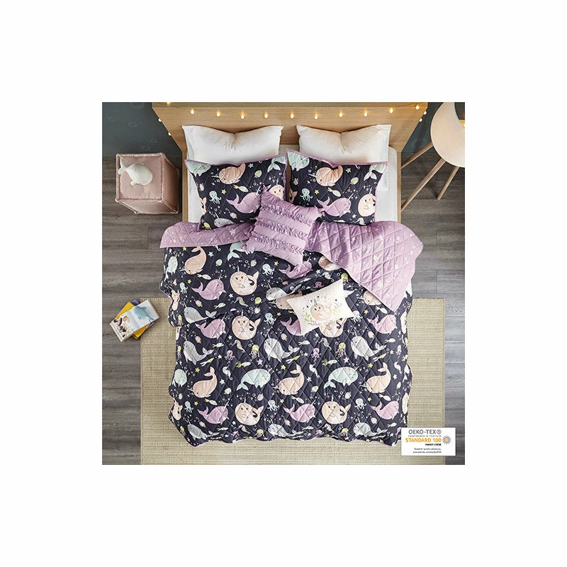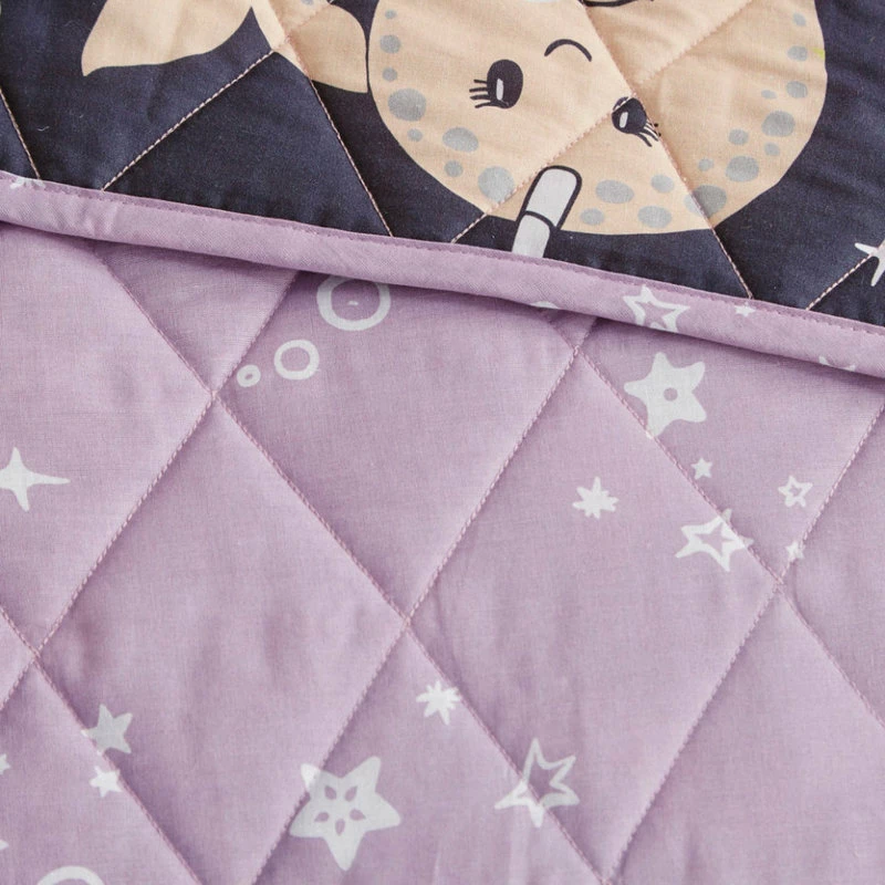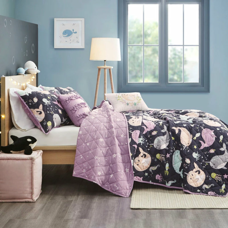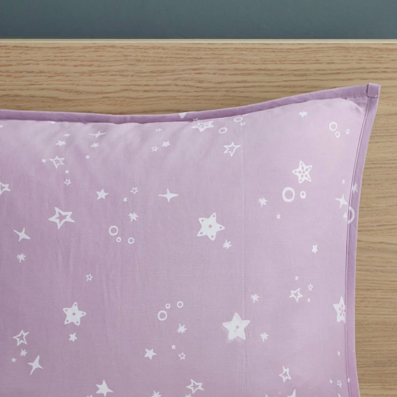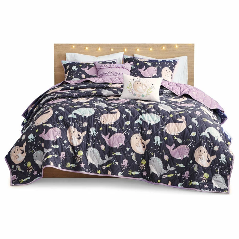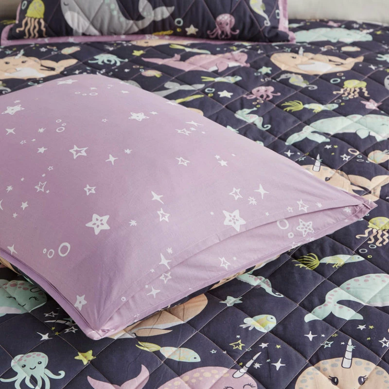 The cotton comforter features a cute narwhal print in soft colors that flips to a star print on the solid reverse. Machine washable for easy care, this kid’s comforter set is sure to brighten your child’s bedroom with a fun and adorable look.