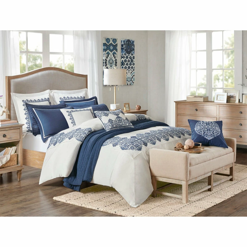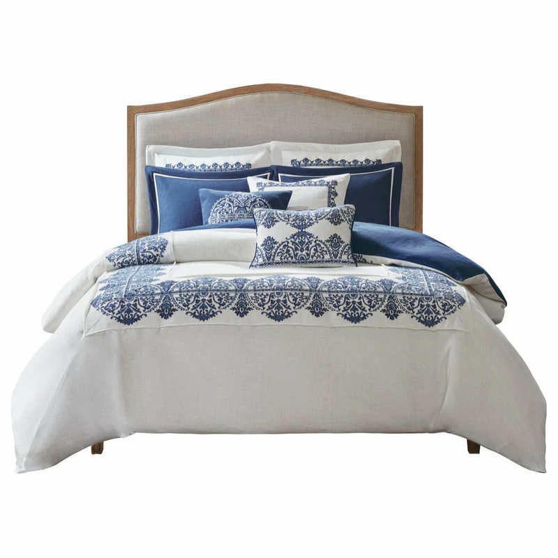 Refresh your bedroom with farmhouse style of the Madison Park Signature Indigo Sky Comforter Set. The faux slub linen off-white comforter flaunts luxurious blue chainstitch embroidery to create a charming transitional look. Coordinating blue shams feature white piping, while the white Euro shams showcase elegant embroidery that complements the top of the bed. Three oversized decorative pillows with embroidered details and hidden zipper closures provide the perfect finishing touches to this luxurious comforter set. The oversized and overfilled comforter uses and includes a removable duvet-style insert that is secured by inner ties and a hidden button closure. This provides no visible bartacking lines on top of the bed to create a smooth, clean face. Dry clean comforter cover only and machine wash comforter filler.