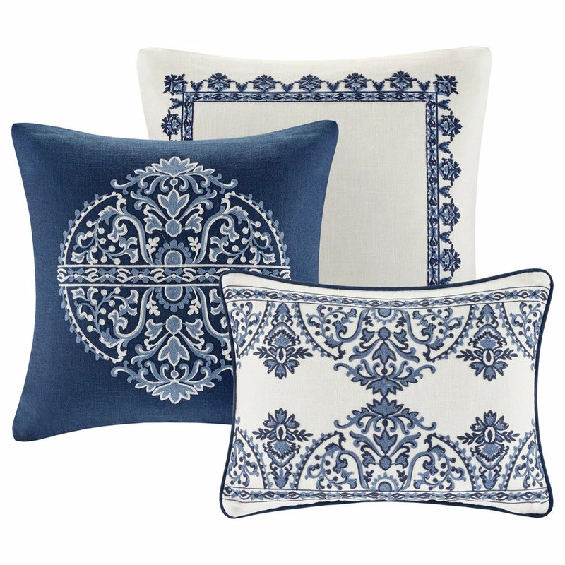 - Set includes comforter, 2 shams, 2 euro shams (3 in King size), 2 square and 1 oblong decorative pillows