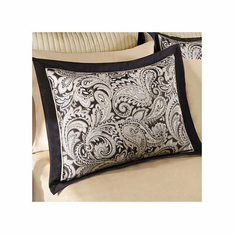 If classic is your style, Aubrey is perfect for you. The jacquard weave is inspired from an updated paisley motif and is woven into a beautiful combination of deep black, gold and a hint of platinum for a touch of sheen to your bedding. The comforter and shams offer beautiful details with a 2″ flange and 1/2″ flat piping in a soft gold. The reverse of the comforter is a rich taupe color. The sheets are 100% cotton, 200 thread count, and the light khaki coordinates back perfectly to the bedding collection. 1 Decorative Pillow: 6.5×18″