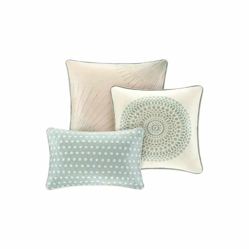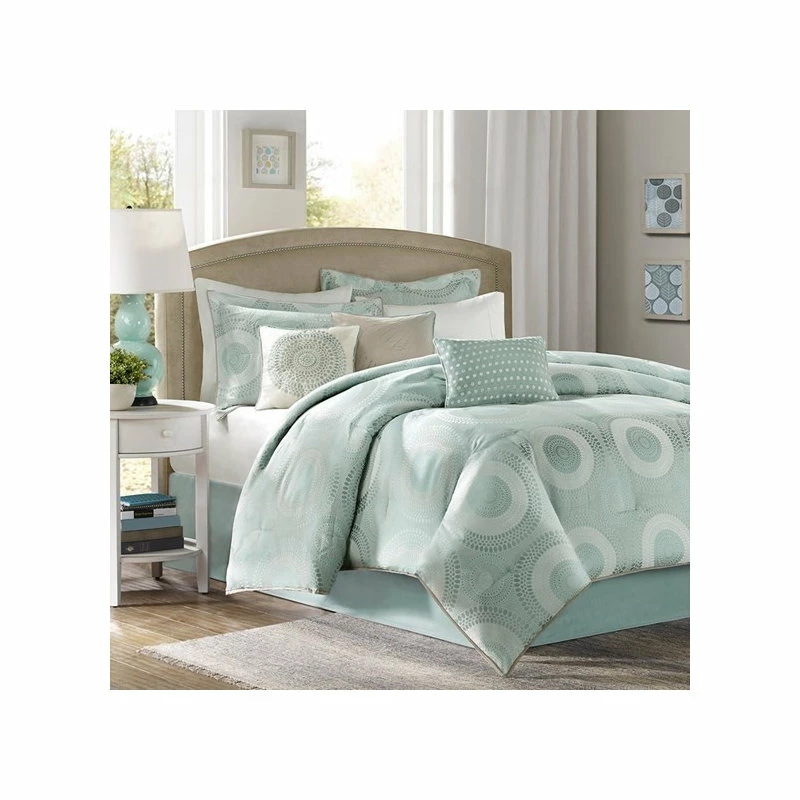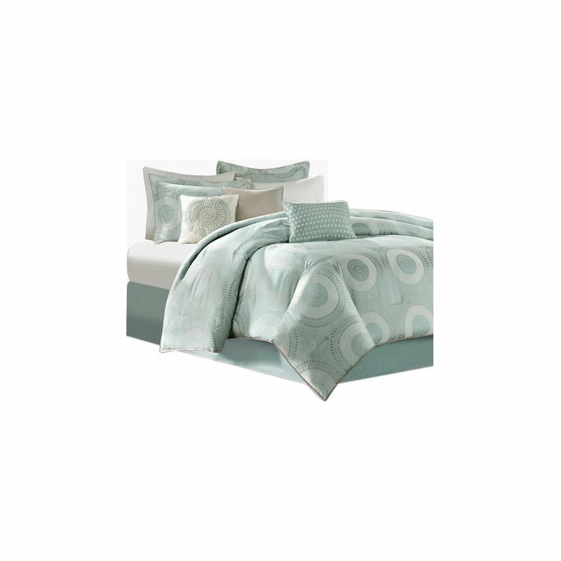 Update your room instantly with the Baxter Bedding Collection. Made from a polyester jacquard fabrication, the mint blue/green color is used as the base for the medallion motif that is spread out across the comforter and shams. A darker blue 1/2″ flange is used on the comforter to add drama to this comforter set and bring your eye to the top of bed. Three decorative pillows with embroidery and pleating details bring this whole look together.