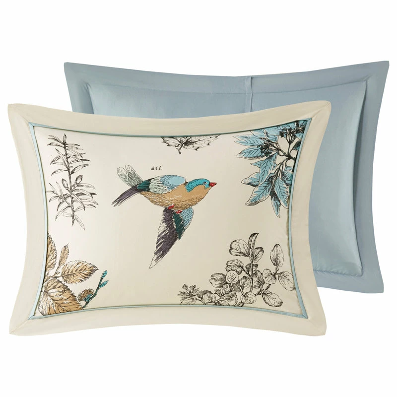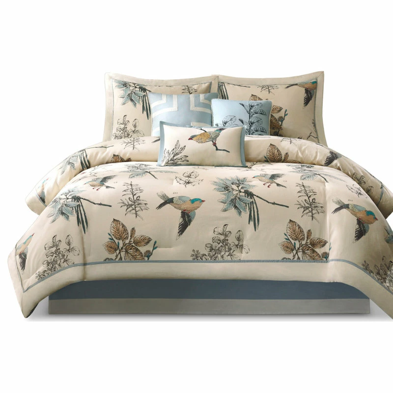 The Madison Park Quincy 7 Piece Comforter Set brings a warm country update to your bedroom. This cotton twill comforter features a classic leaf and bird print on the face with a solid reverse that adds a splash of color to the cottage look. Two matching shams pair perfectly with the comforter and three decorative pillows add dimension. A solid bed skirt provides the finishing touch, completing the comforter set. This bedding set is also OEKO-TEX certified, meaning it does not contain any harmful substances or chemicals to ensure quality comfort and wellness.