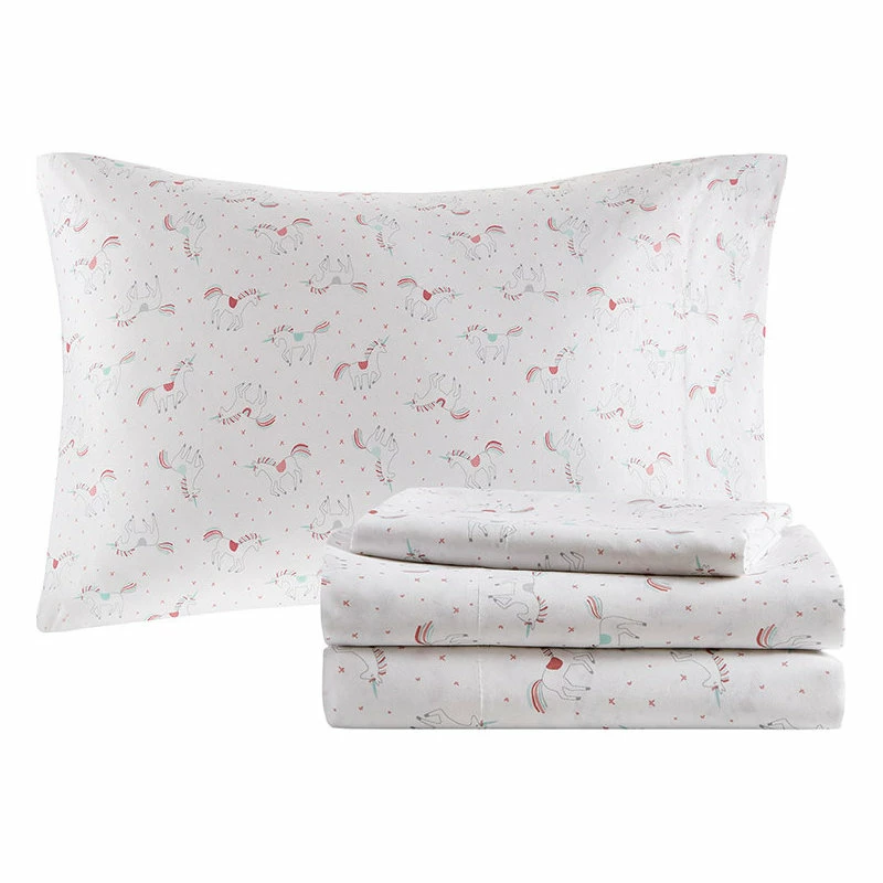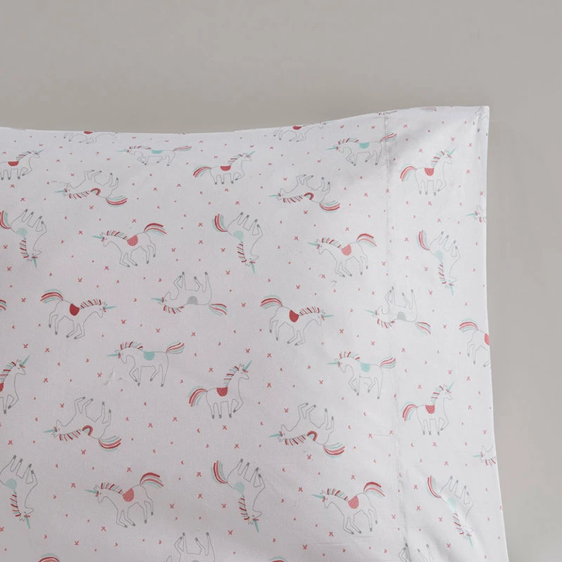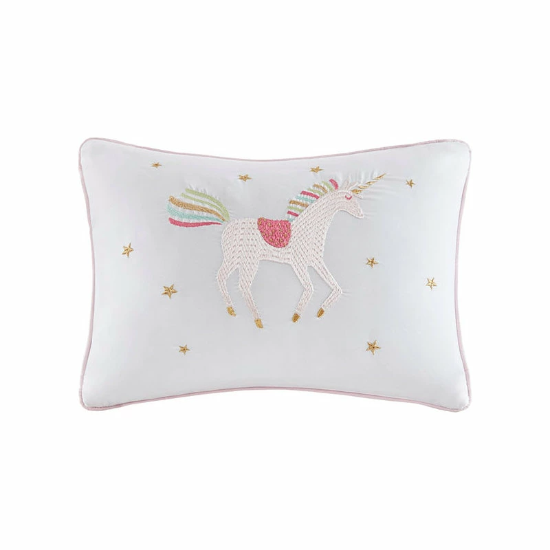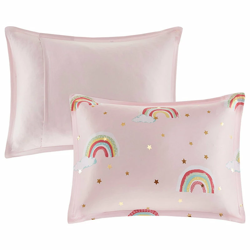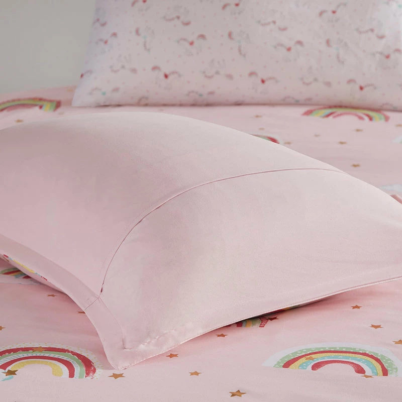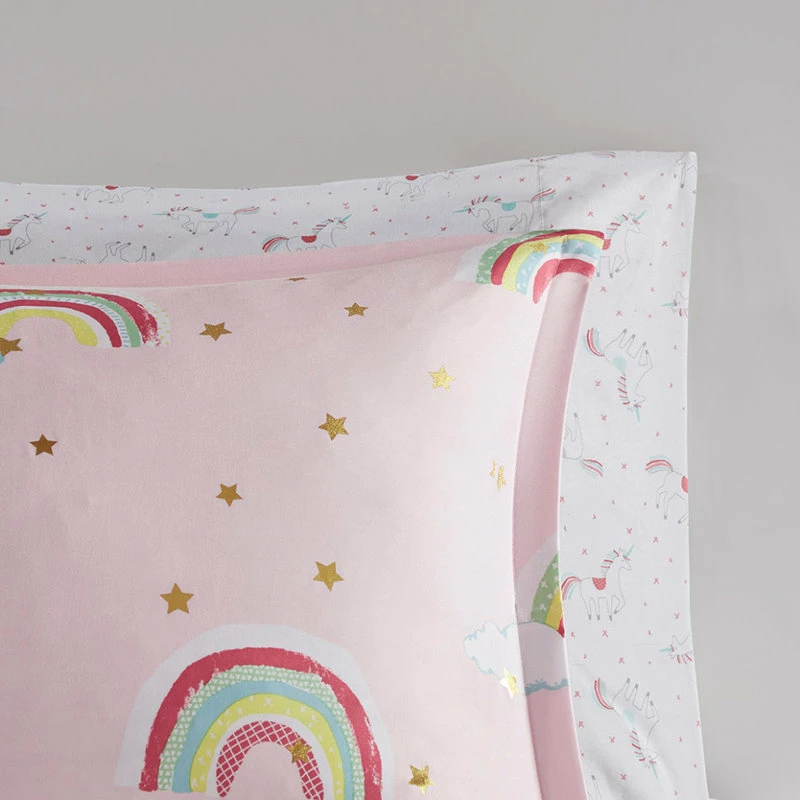 Bring a whimsical charm to your girl’s bedroom with the Mi Zone Kids Alicia Rainbow and Metallic Stars Comforter Set with Bed Sheets. An adorable rainbow and gold metallic star print adorns the pink comforter and 2 shams (1 in Twin/TwinXL) for a cute and playful look. The included complete sheet set features a fun unicorn print that coordinates beautifully with the kid’s comforter set, while an oblong decorative pillow provides a fun finishing touch. Hypoallergenic polyester filling in the comforter and decorative pillow provide extra softness and comfort. Machine washable for easy care, this kid’s comforter and sheet set brightens up your child’s bedroom with its delightful allure. This bedding set uses an antimicrobial treatment that provides built-in freshness protection, reducing the growth of odor causing bacteria to keep fabric lasting longer. Items in the set may come in a rolled or compressed packaging, which will need to be fluffed up or steam ironed before use to remove wrinkles.