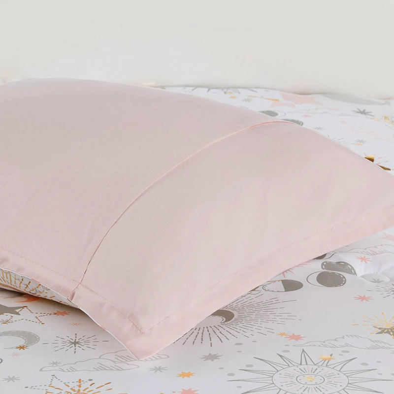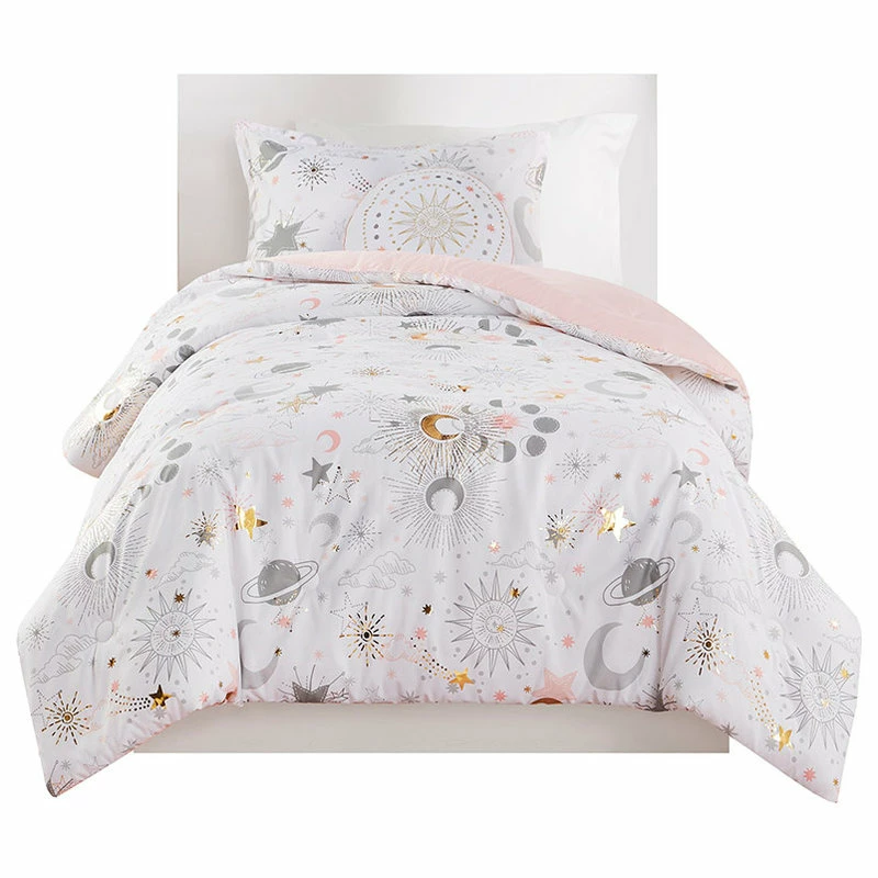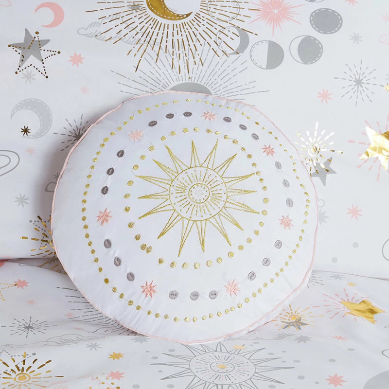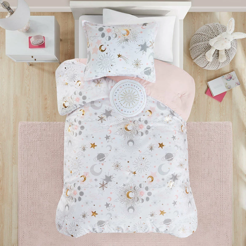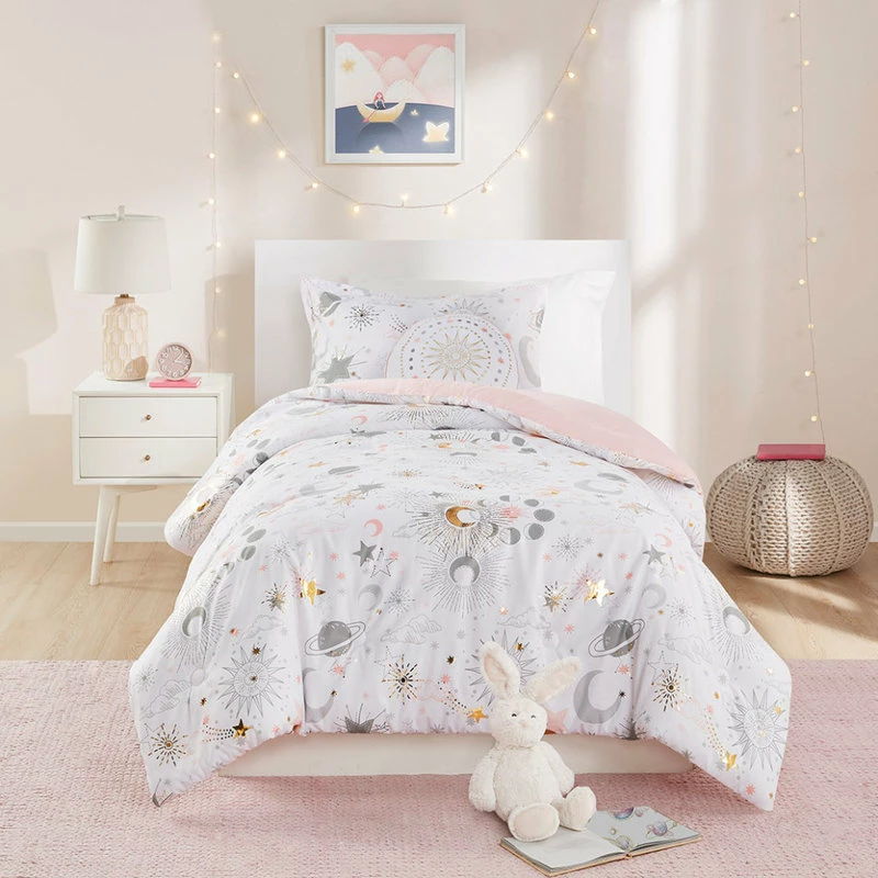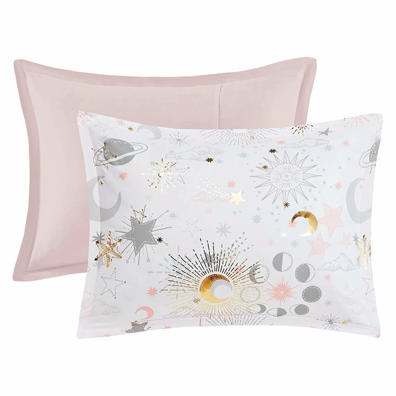The girl’s comforter flaunts gold metallic stars and moons that sparkle against the soft fabric for a magical celestial look. The matching shams repeat the pattern of the starry comforter and a round decorative pillow with embroidered details adds a cute finishing touch.