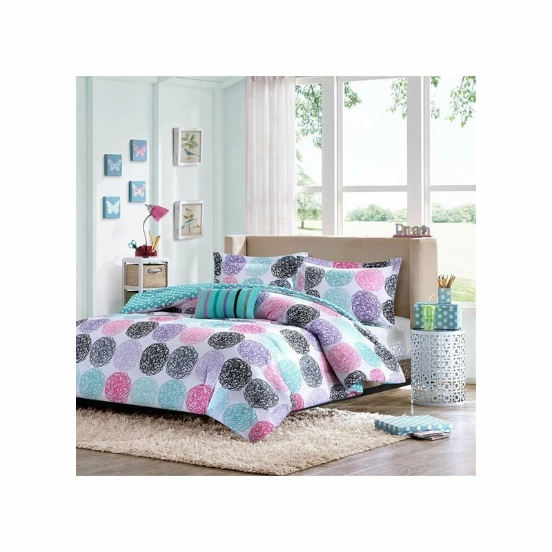 Add color to your bedroom with the Mi Zone Carly Comforter Set. Doodled circles create this look with pops of pink, teal, purple and black while a teal polka dot reverse plays up the back. A fun decorative pillow uses stripes of twill tape to showcase all the major colors from the top of bed. Set includes comforter, 2 shams (1 sham in Twin/TwinXL), 1 oblong decorative pillow. Comforter and shams are machine washable.