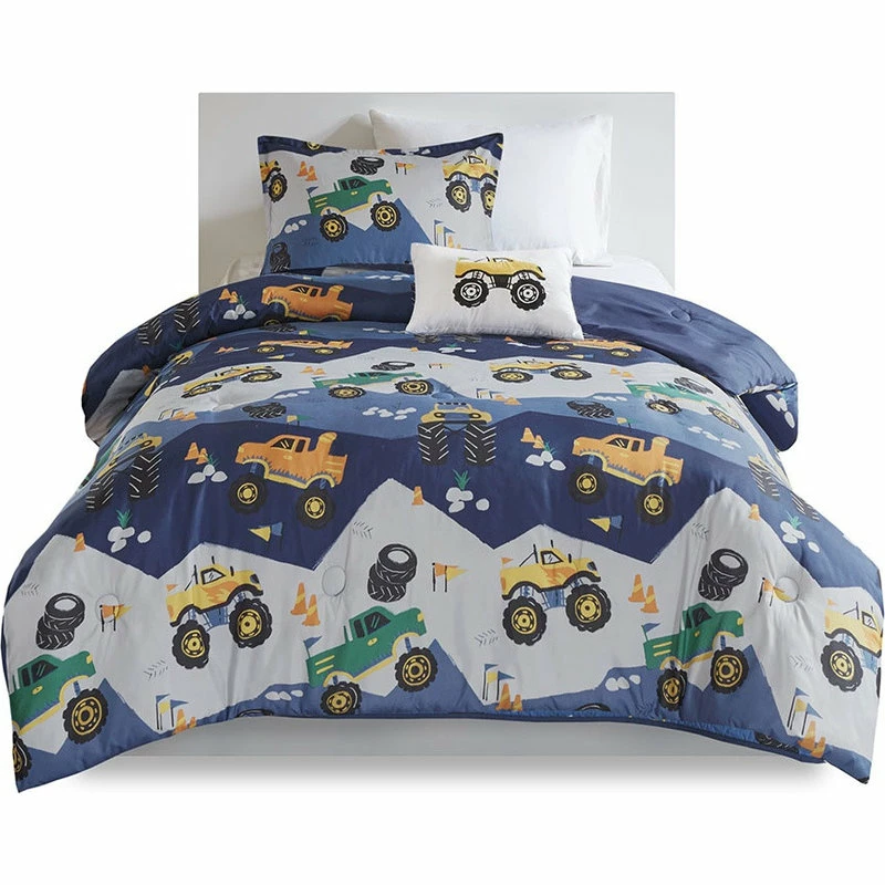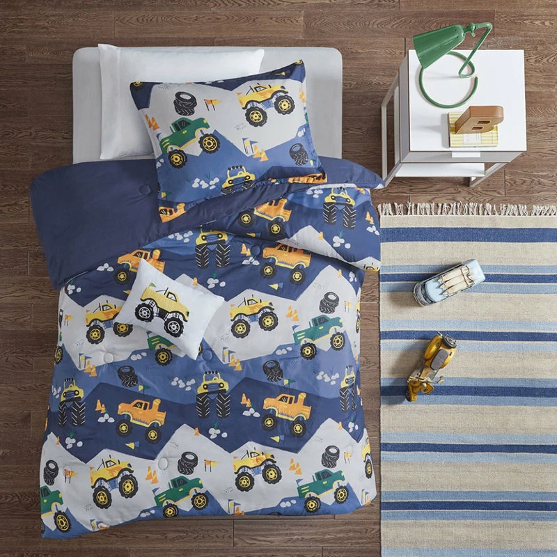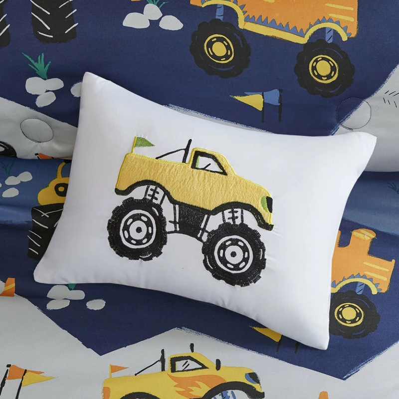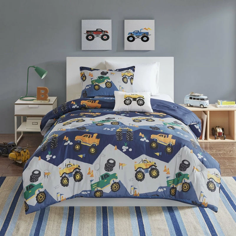 Cruise off to dreamland with the Mi Zone Kids Nash Printed Comforter Set. This ultra-soft blue and grey comforter and shams (1 in Twin/Twin XL) features a colorful monster truck print and a solid blue reverse to create a fun and exciting look. An oblong decorative pillow with a plush applique truck on the face completing the comforter set. Machine washable for easy care, this boy’s first comforter set offers an adorable update to your child’s bedroom. This child’s comforter set uses an antimicrobial treatment that provides built-in freshness protection, reducing the growth of odor causing bacteria to keep fabric lasting longer.