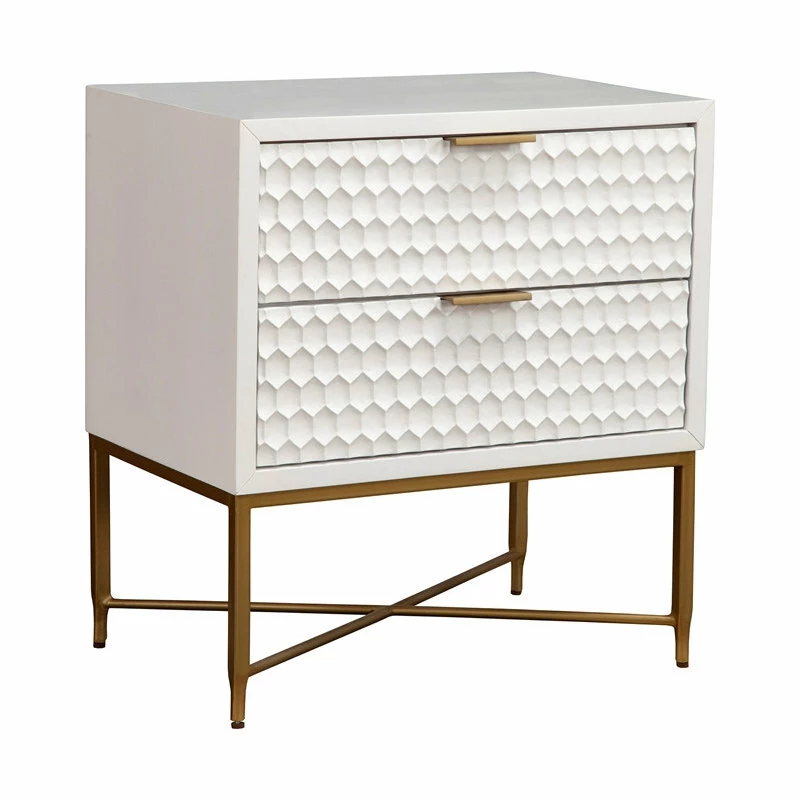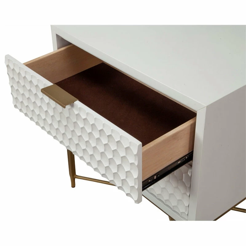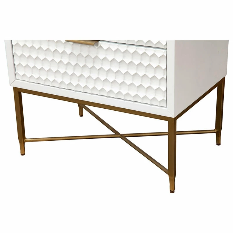 Sophisticated Contemporary Styling, the White Pearl Nightstand looks great in any bedroom. This piece can be used with the matching bed or coordinated with an upholstered bed. The 2 storage drawers feature textured drawer fronts and gold handles. The gold metal base gives the piece an open, off-the-floor look and simplifies cleaning. Coordinates with other pieces from the Origins by Alpine White Pearl bedroom collection sold separately.