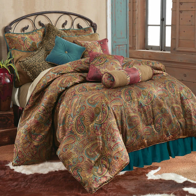 The HiEnd Accents San Angelo collection mixes paisley print with fun pops of leopard chenille, red faux leather, and teal velvet for a designer collection with western flair. This 4 piece set includes a comforter, Bedskirt, and two coordinating pillow shams. Additional accent pieces are available separately for you to build the perfect collection. Dry clean recommended.