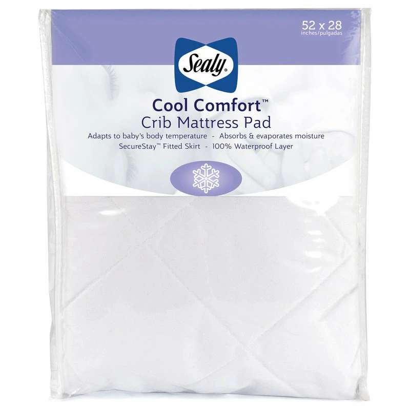 The Sealy Cool Comfort Crib Mattress Pad Protector helps keep baby cool, dry and comfy. The innovative top fabric features temperature balancing technology that adapts and responds to baby’s body temperature for optimal cooling comfort. The moisture wicking fibers release excess heat and moisture to create a cooler, dry sleeping surface for infants and toddlers. Plus, this fitted crib pad has a 100% waterproof barrier to protect baby’s mattress from leaky messes, spills and moisture.